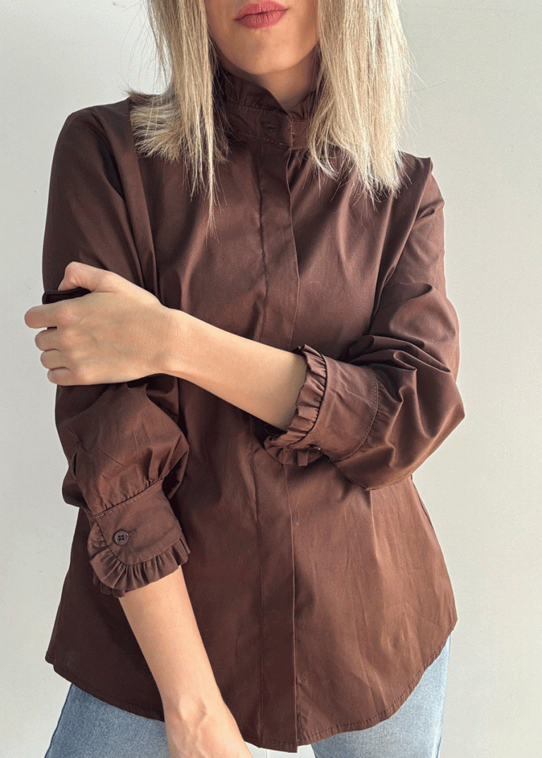 Camisa manga comprida, botões à frente escondidos, folho na manga e na gola.