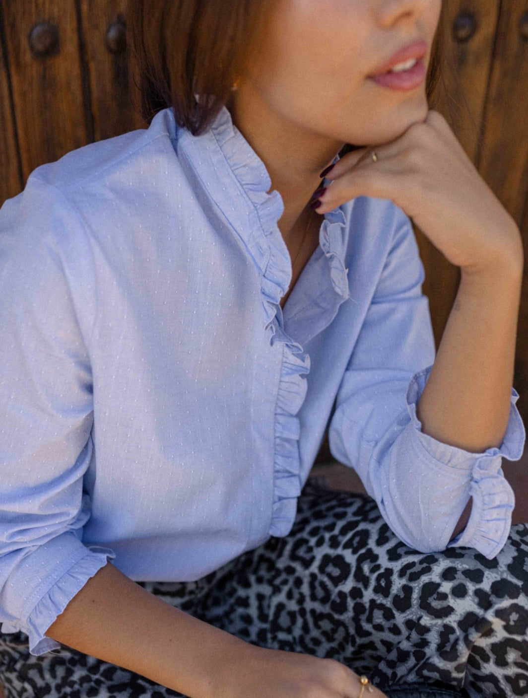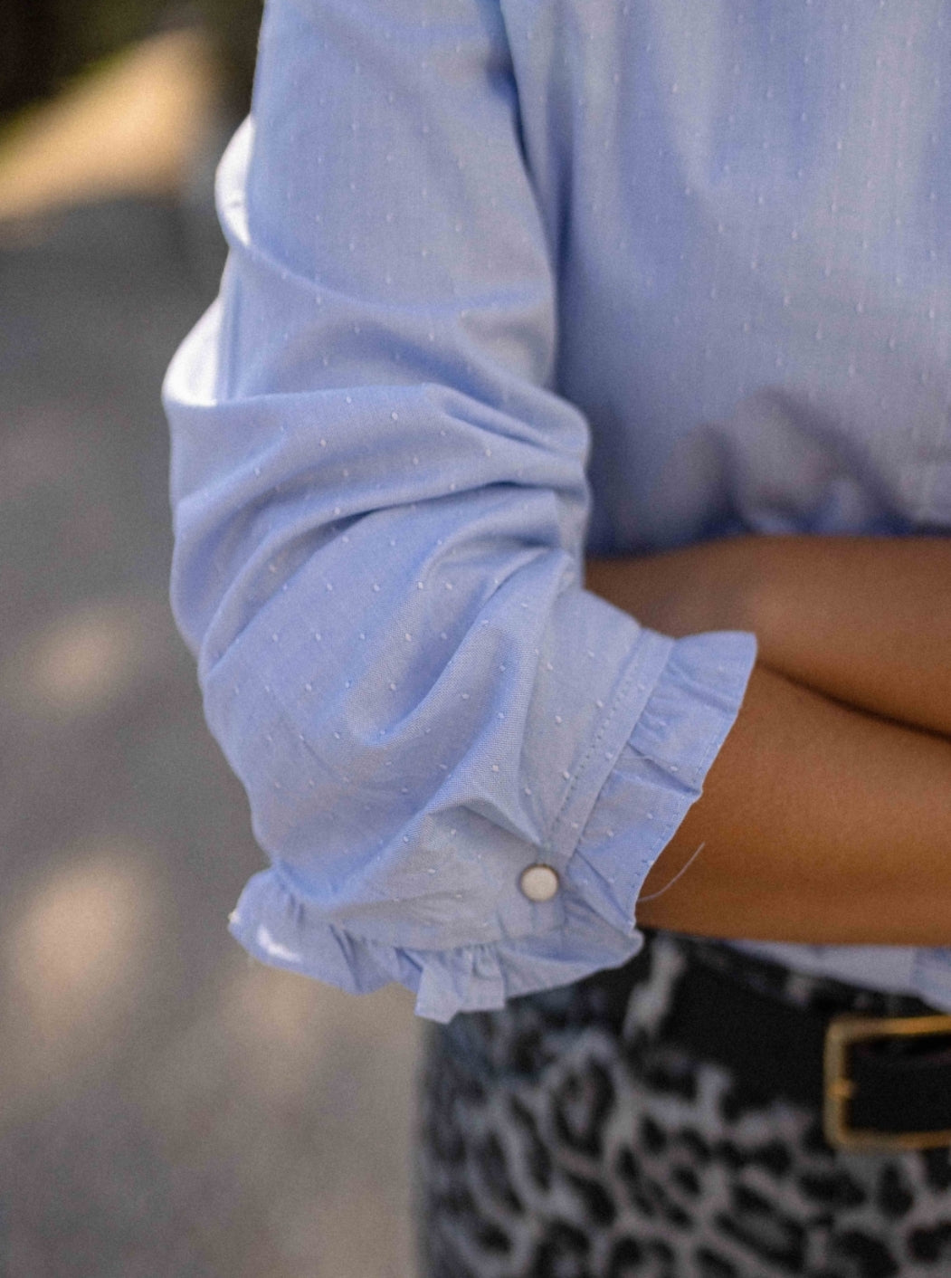 Camisa manga comprida c/ folho no punho, folho frontal, botões escondidos.
