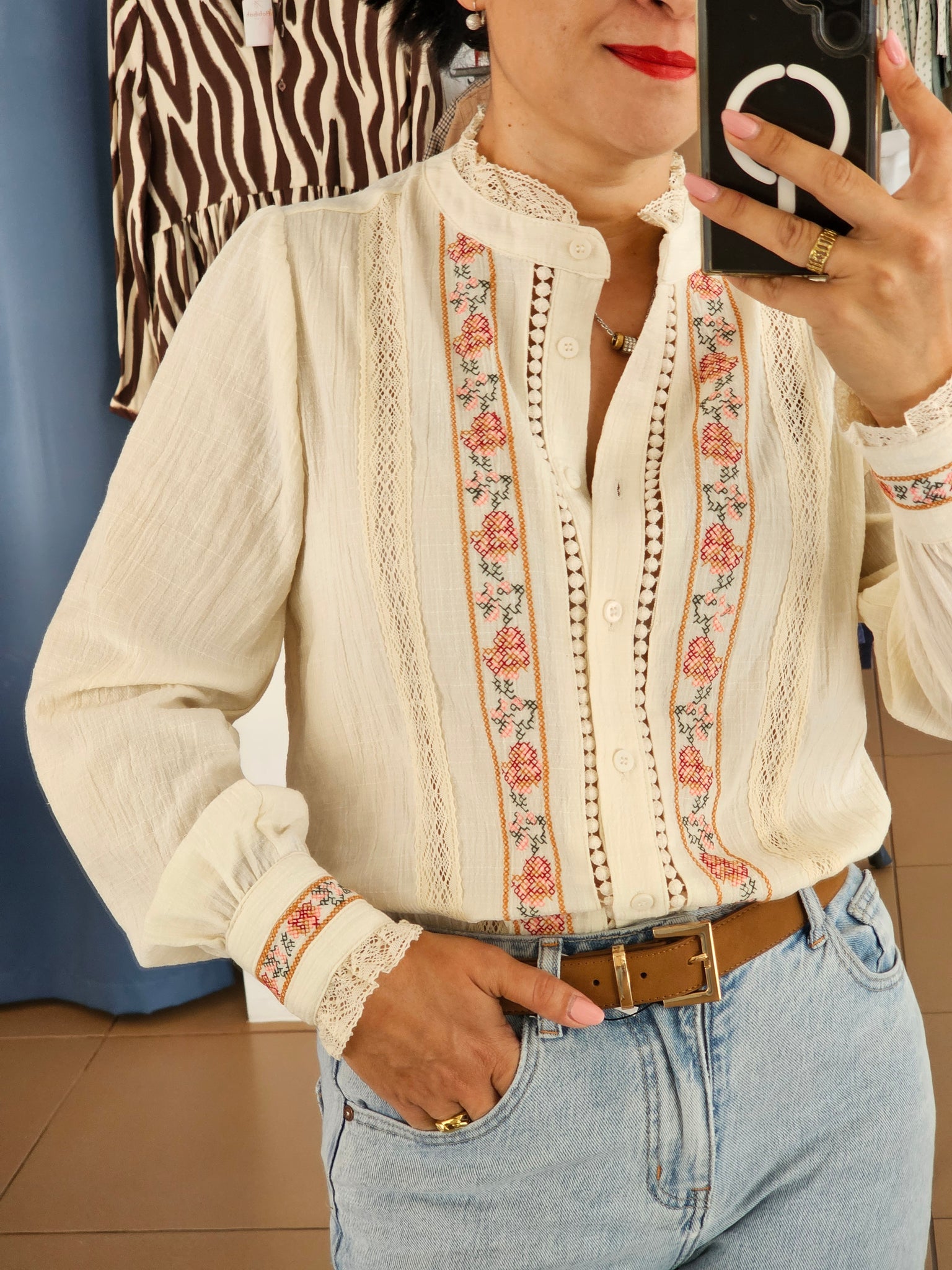 Camisa bordada efeito ponto de cruz. Rendado na gola e frente.