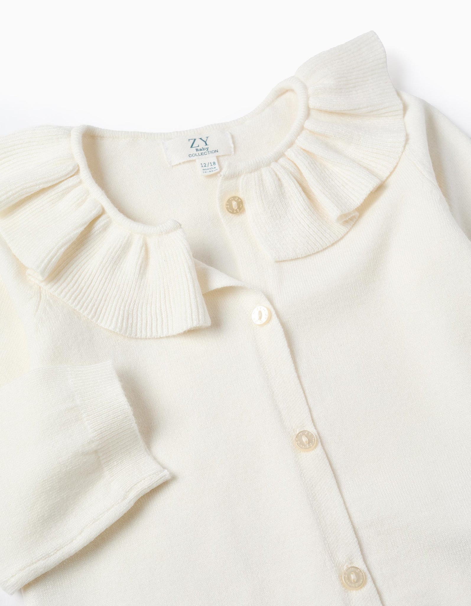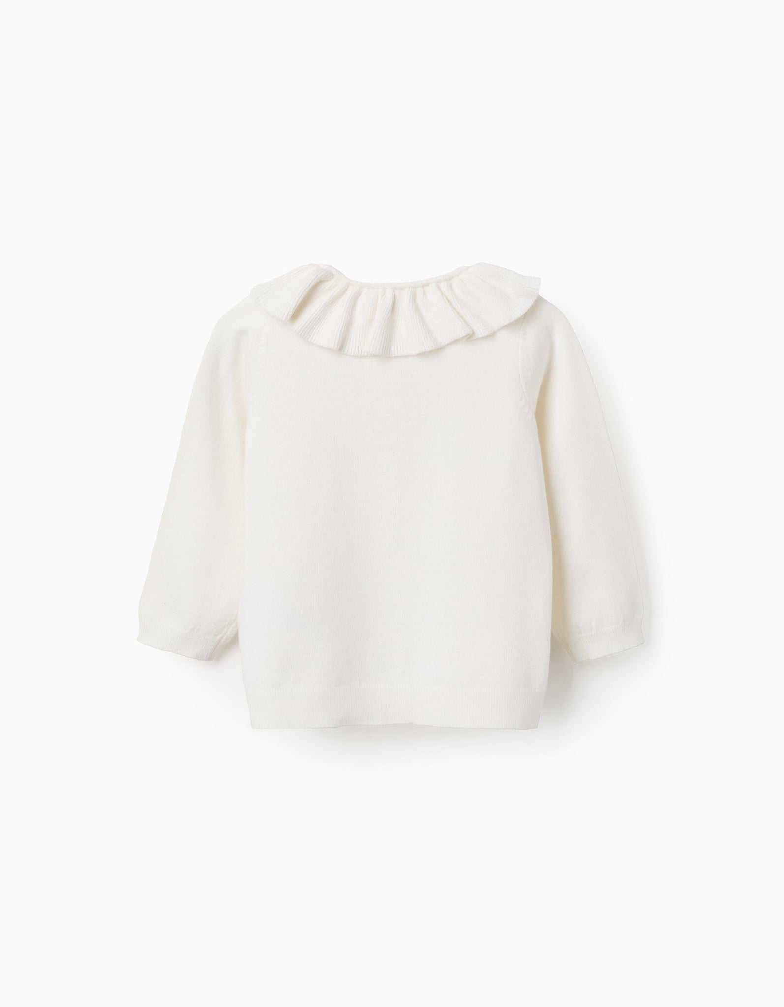 Casaco de malha branco para bebé menina. Gola de folhos. Extremidades caneladas para um ajuste perfeito. Uma opção suave, confortável e elegante!