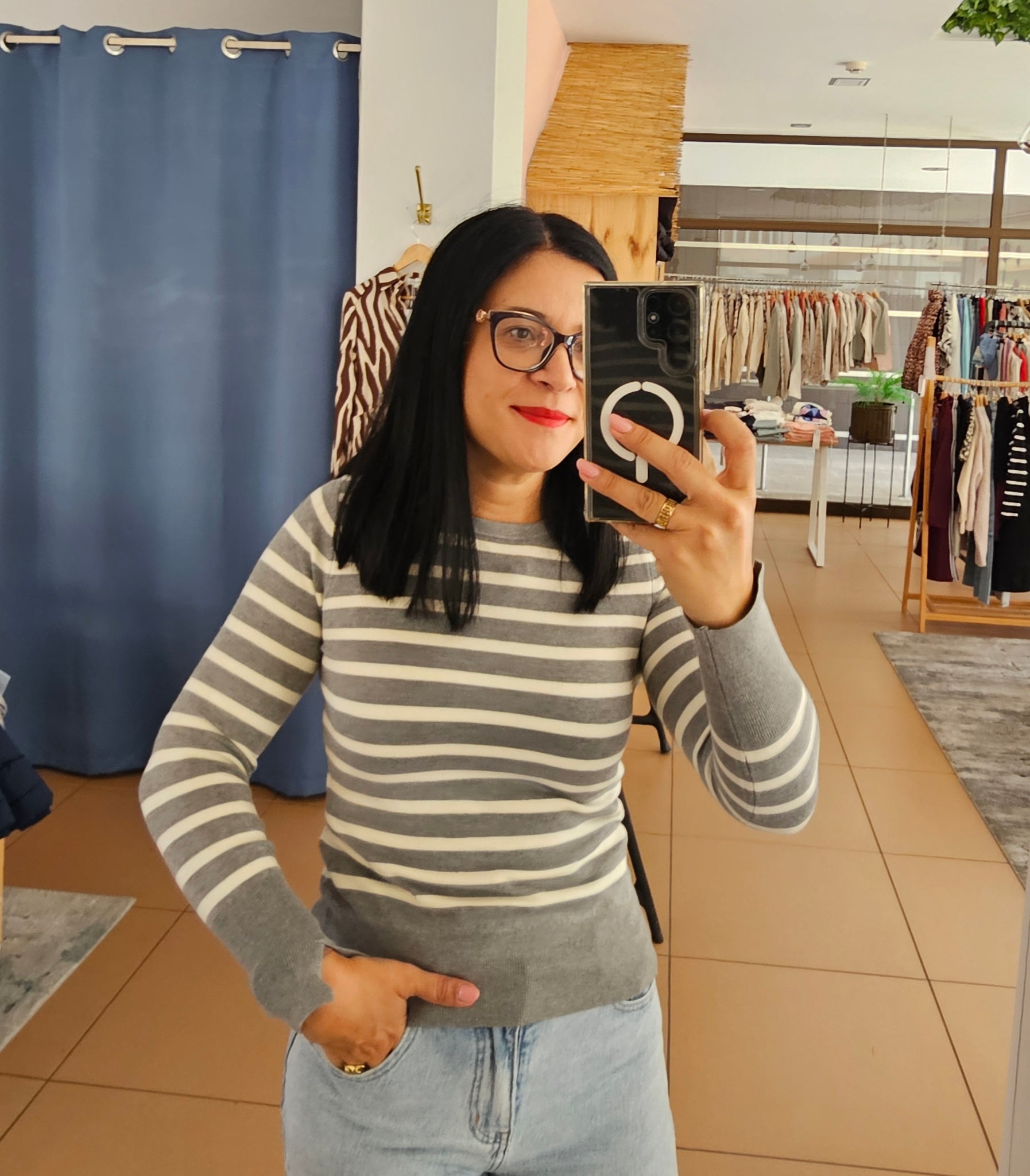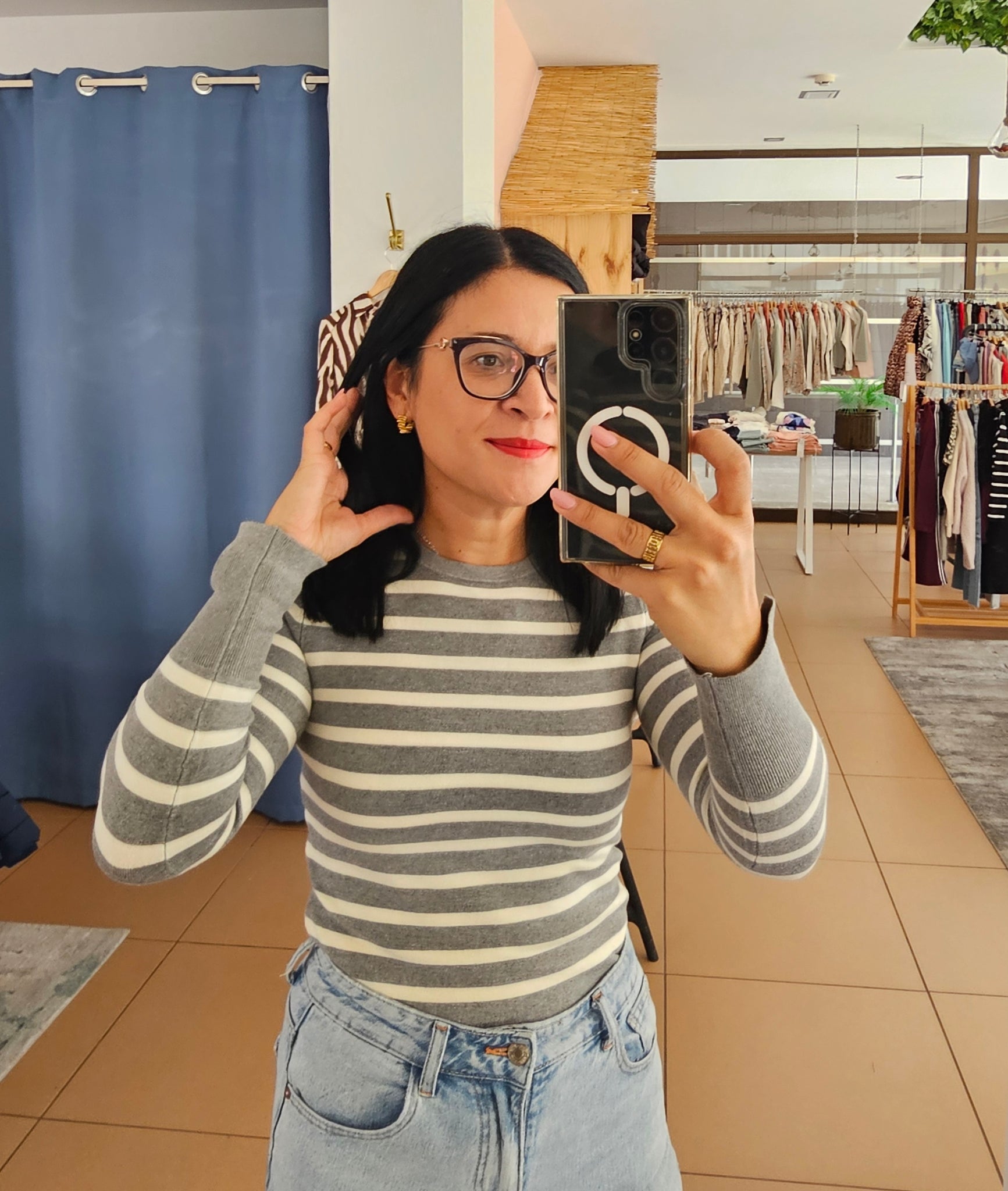 Camisola malha fina manga comprida. Riscas cinza e cru.