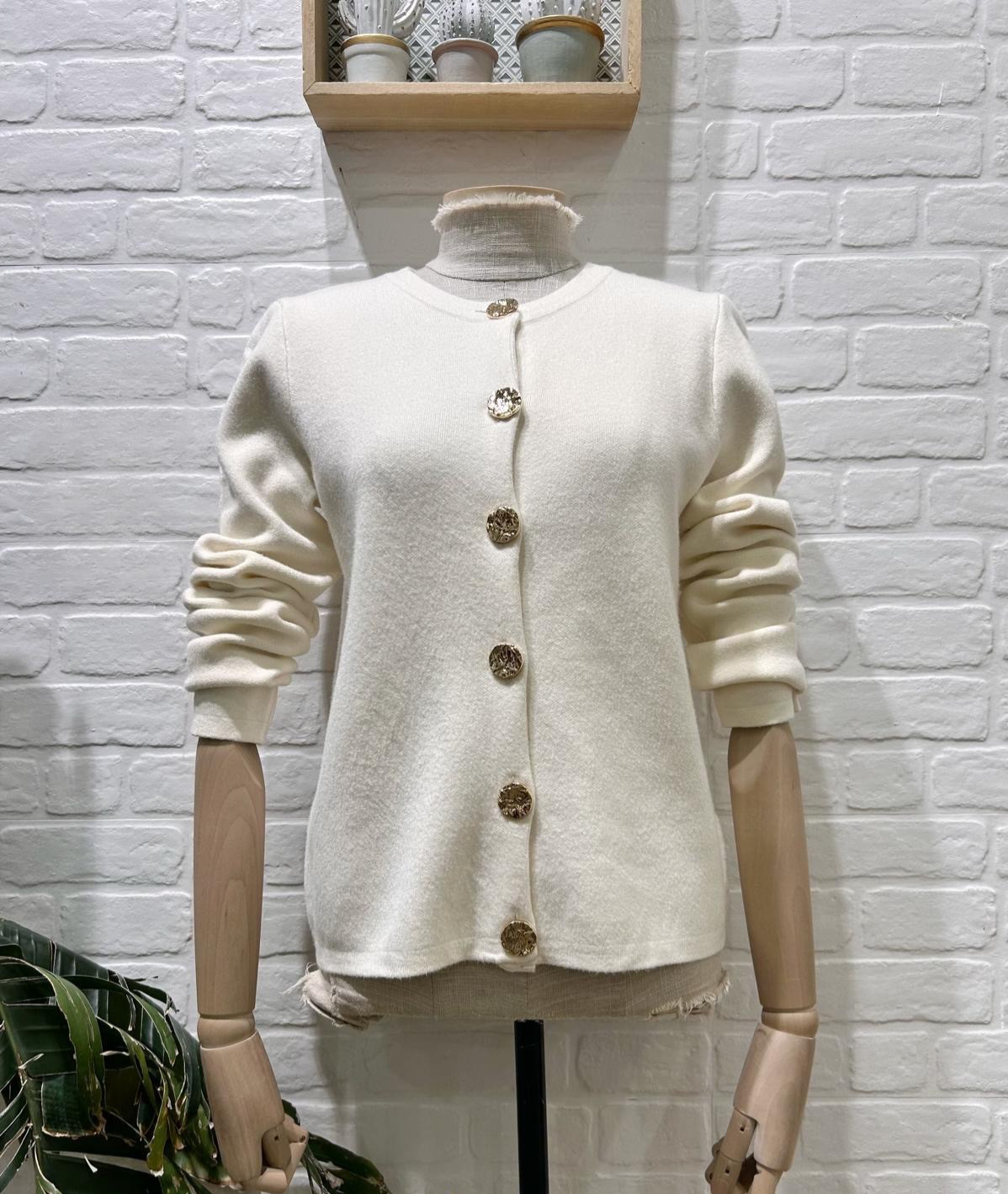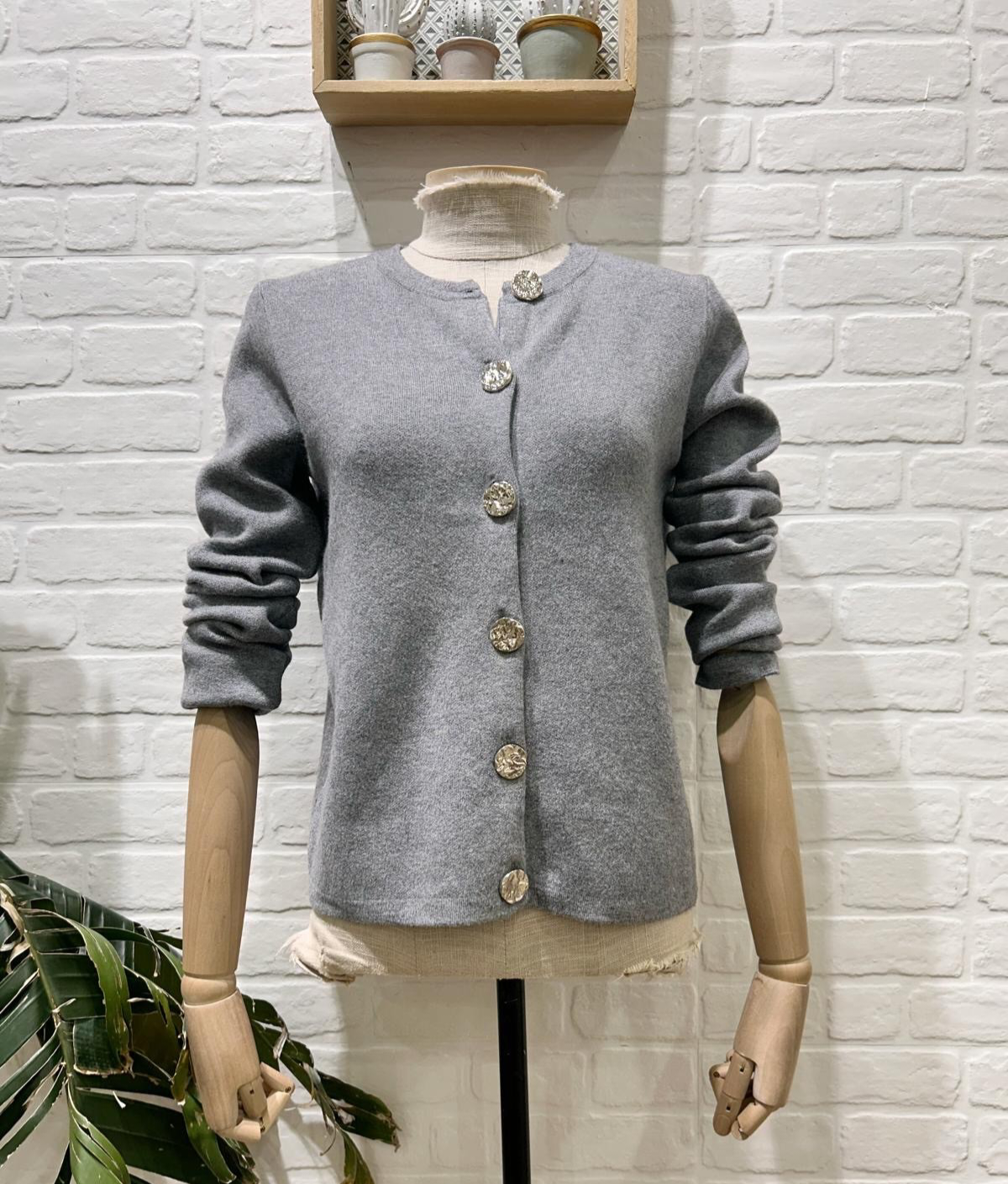 Cru e taupe com botões dourados. Cinza com botões prateados.