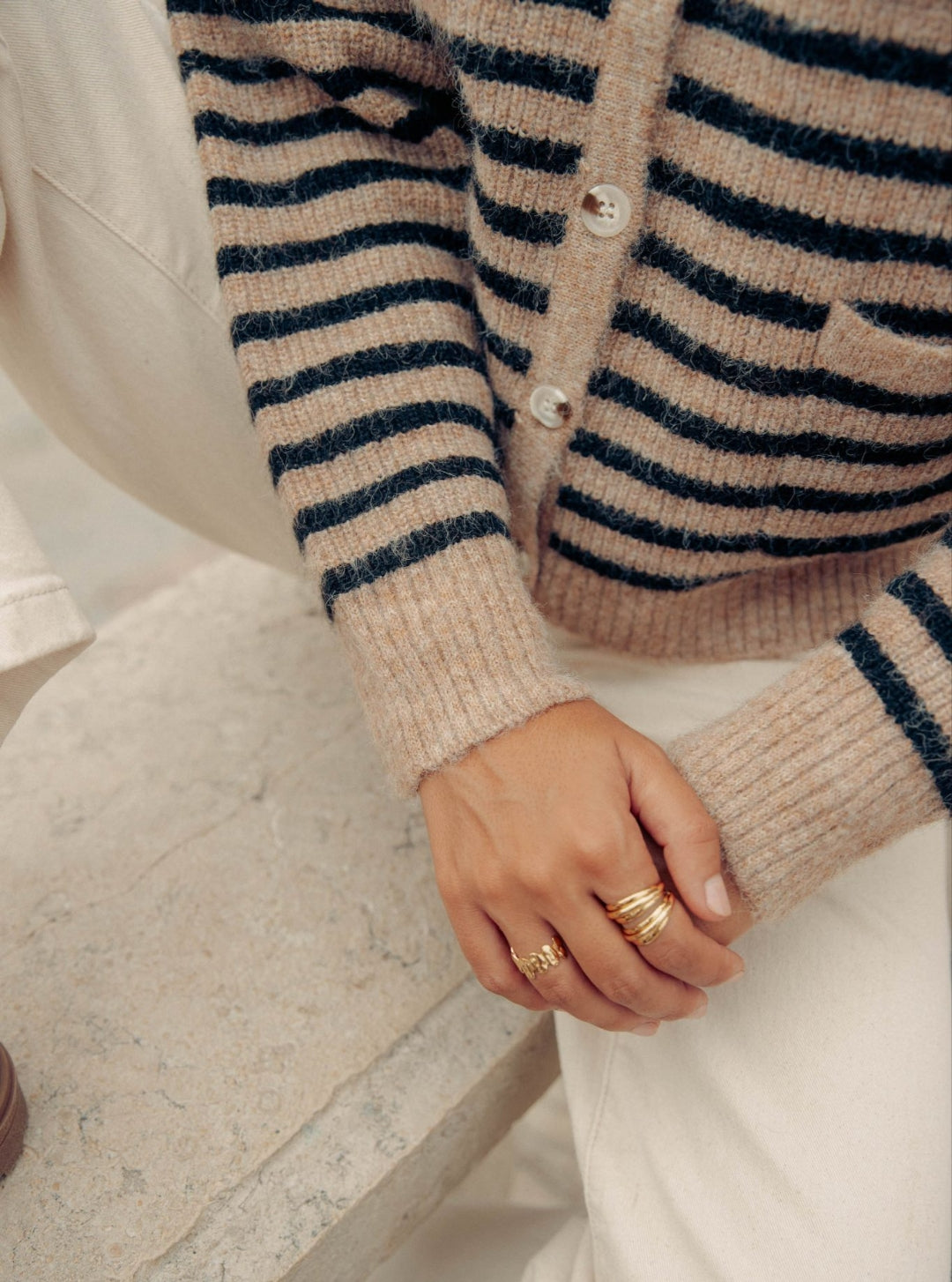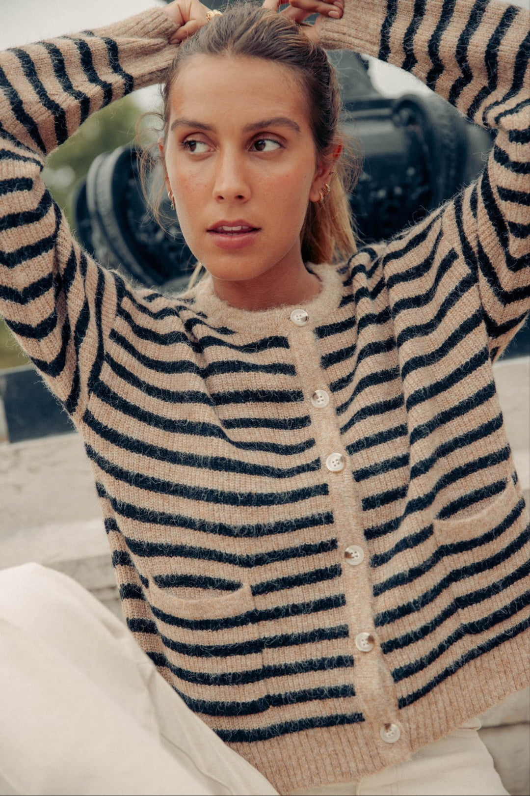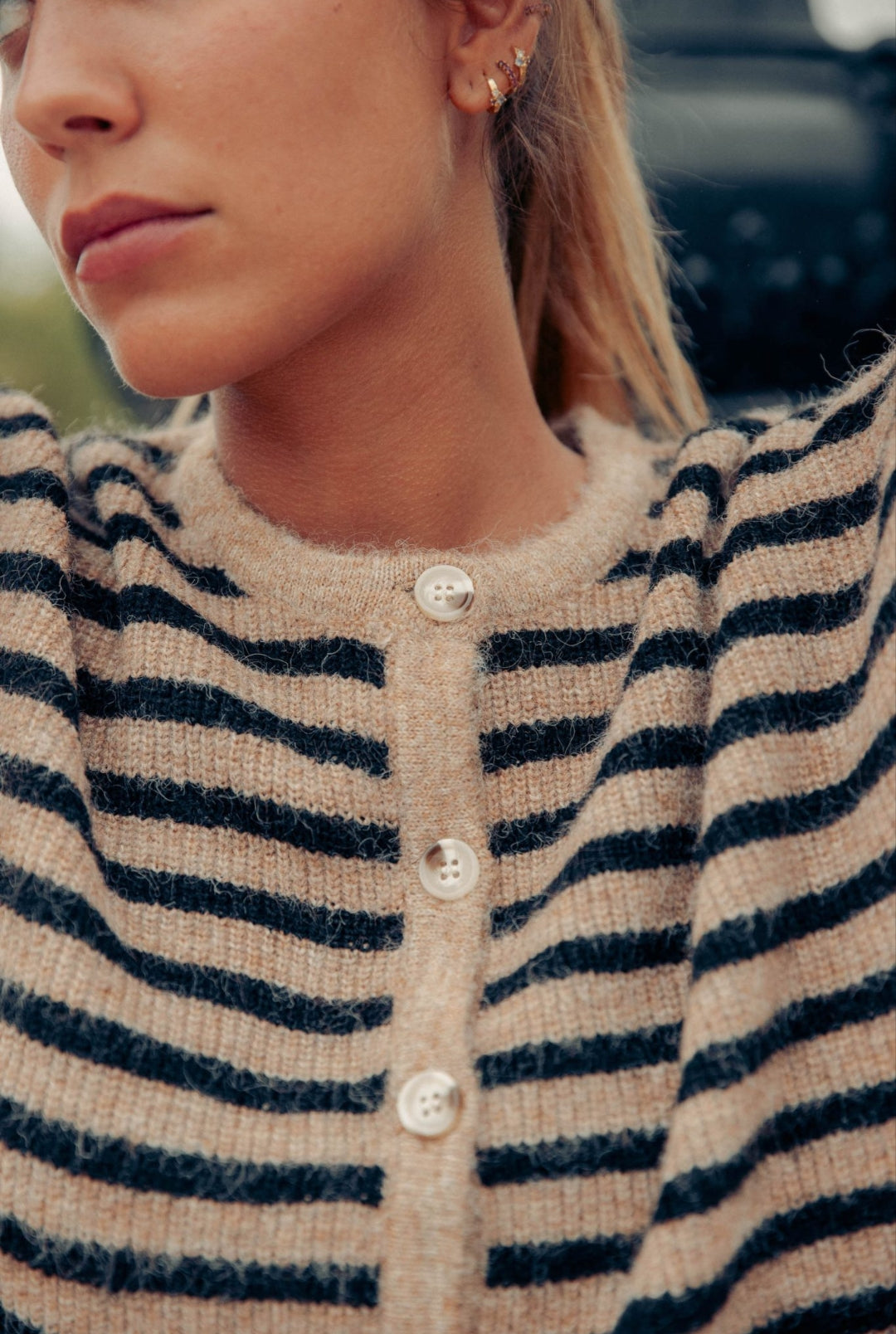 Casaco em malha. Botões frontais.