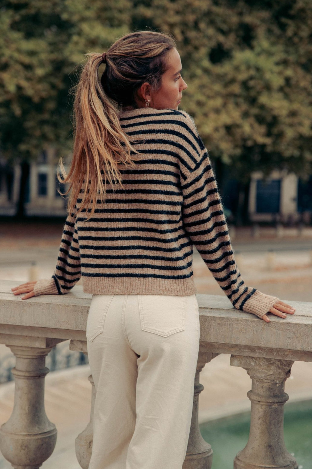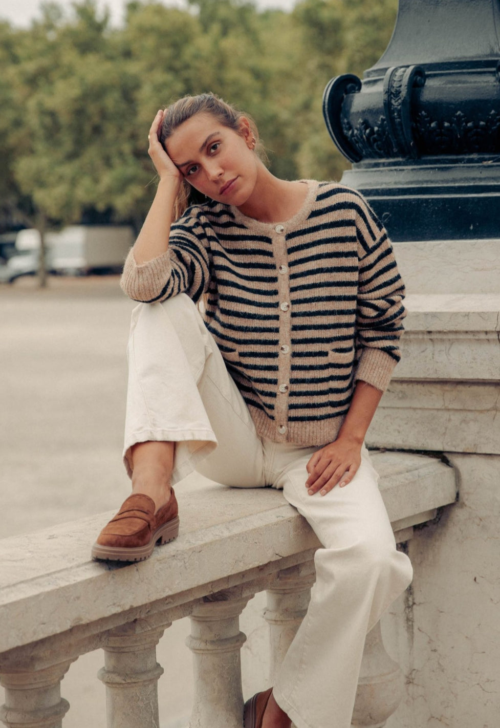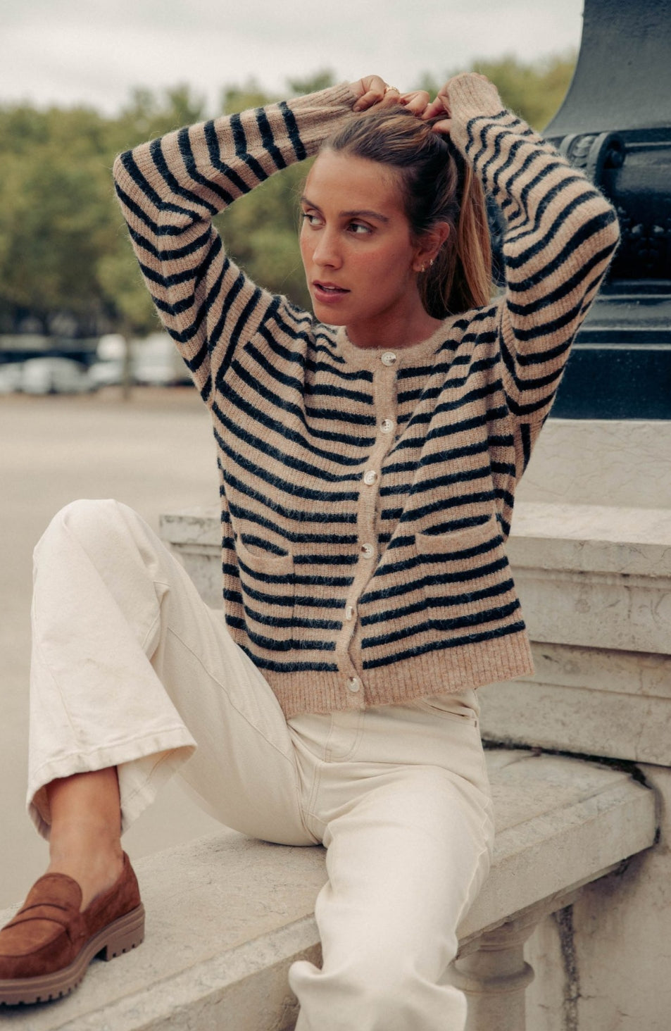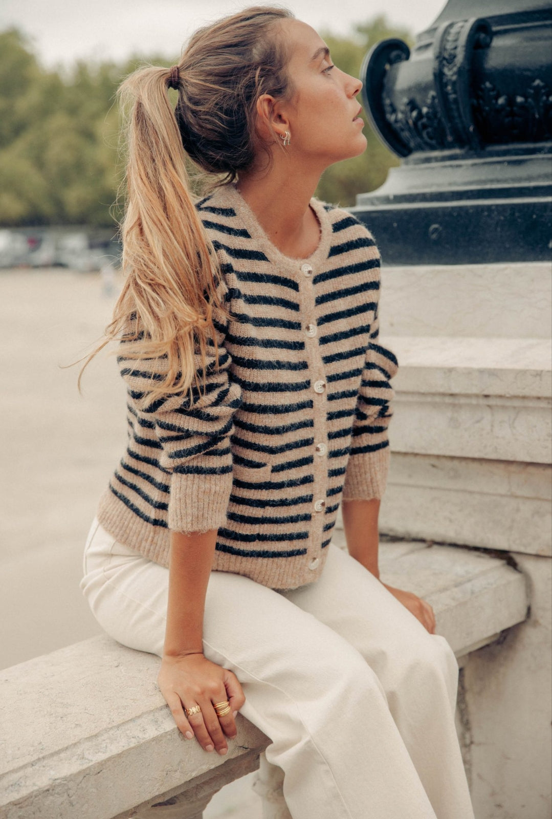 Casaco em malha. Botões frontais.