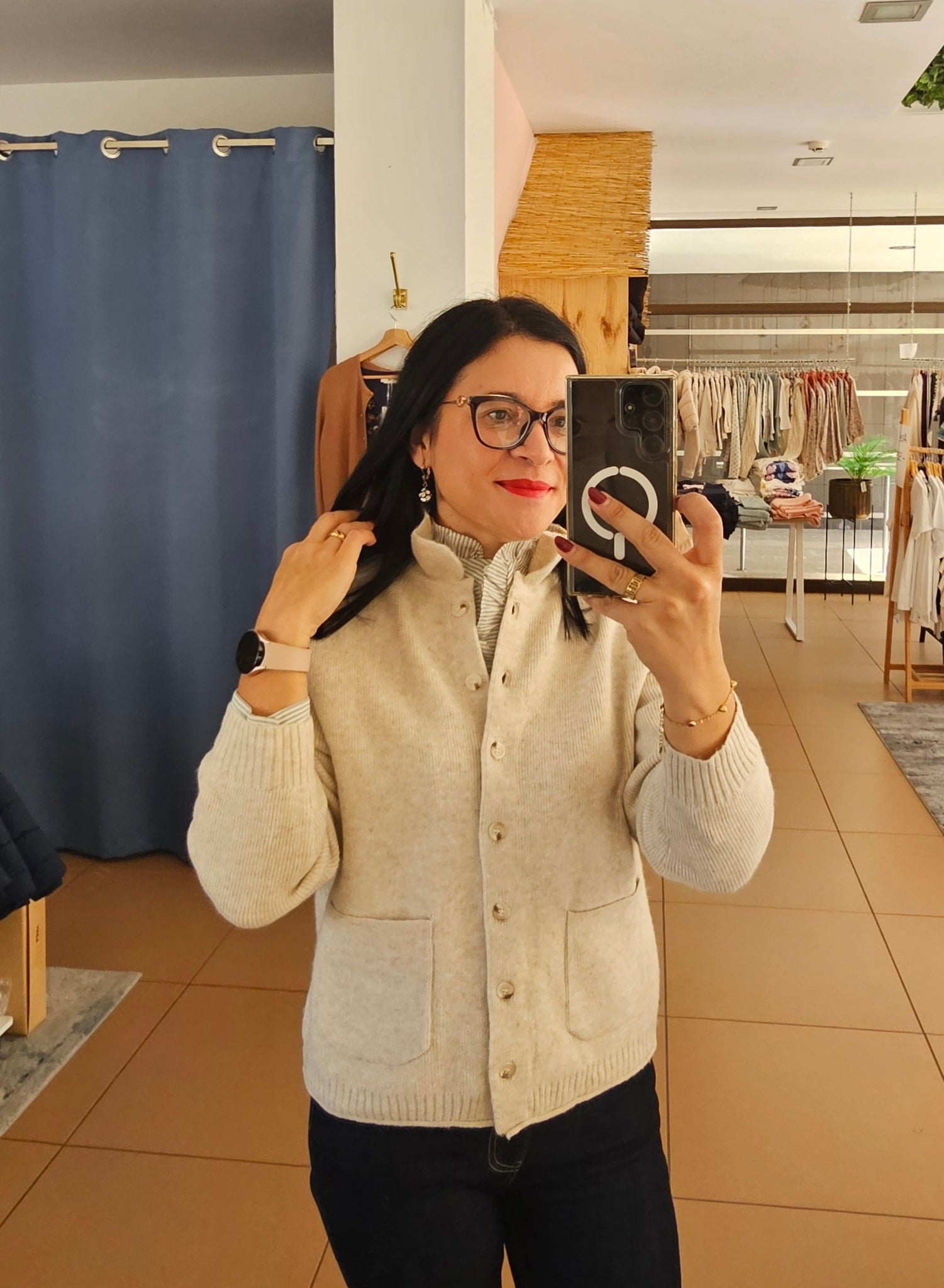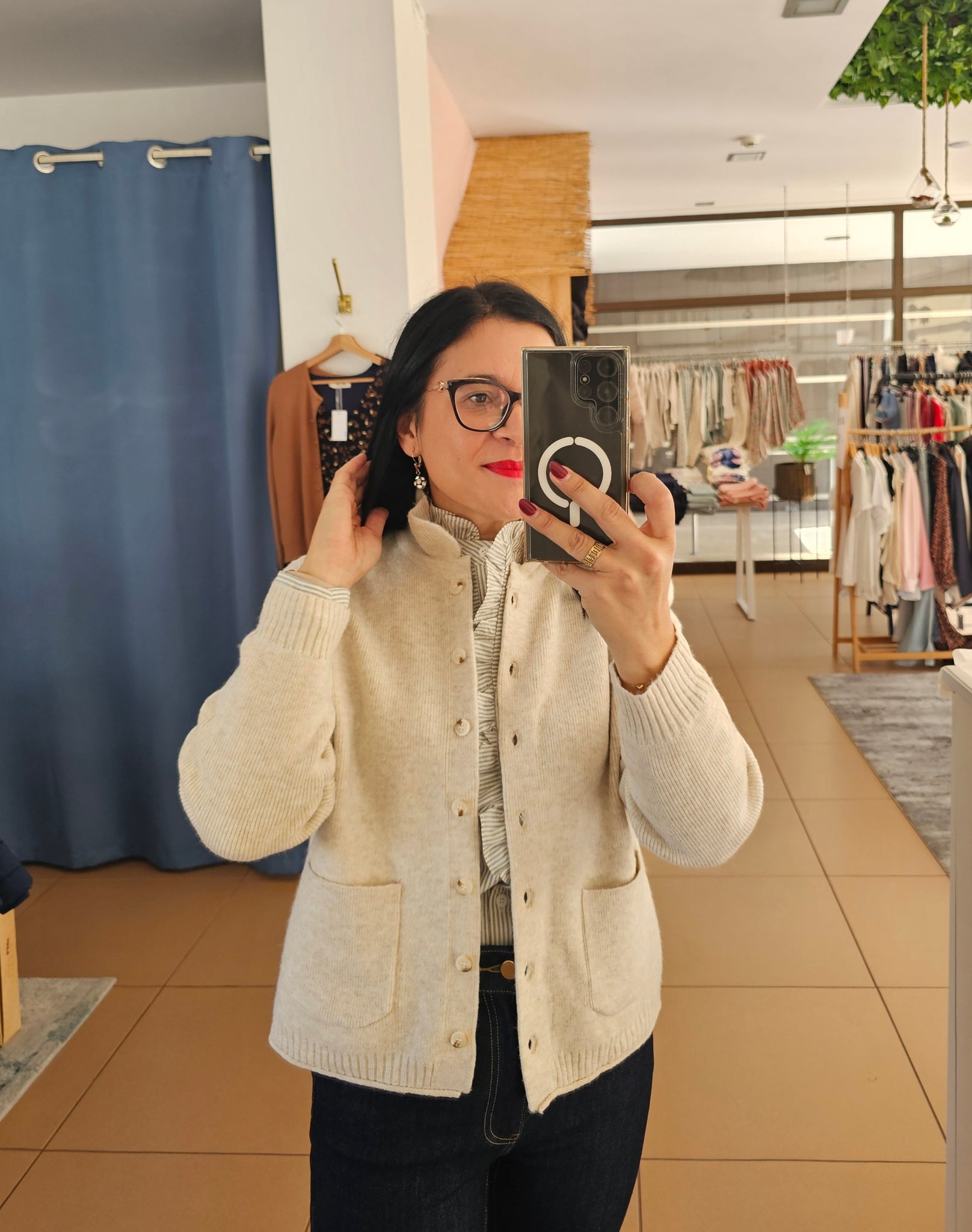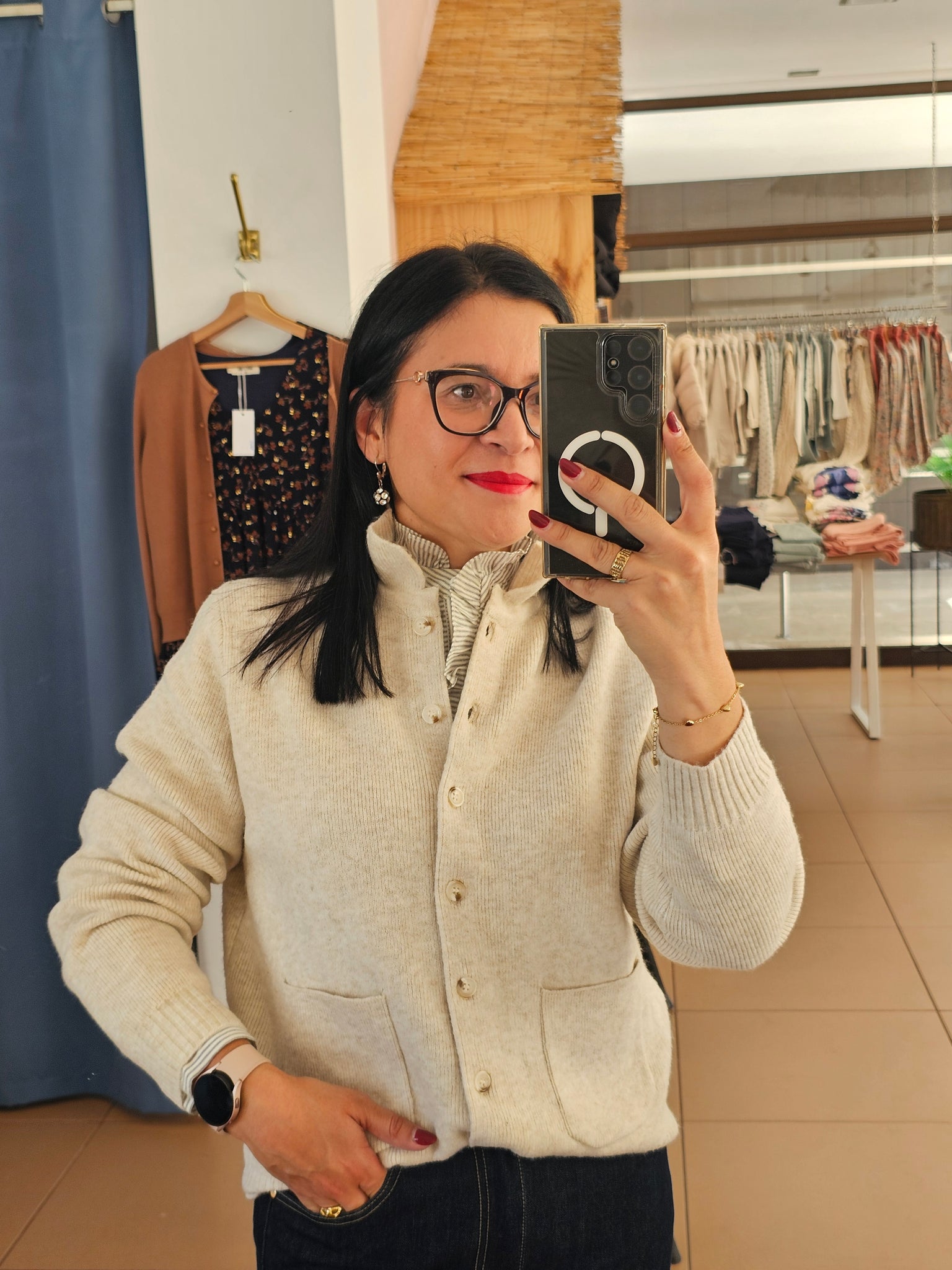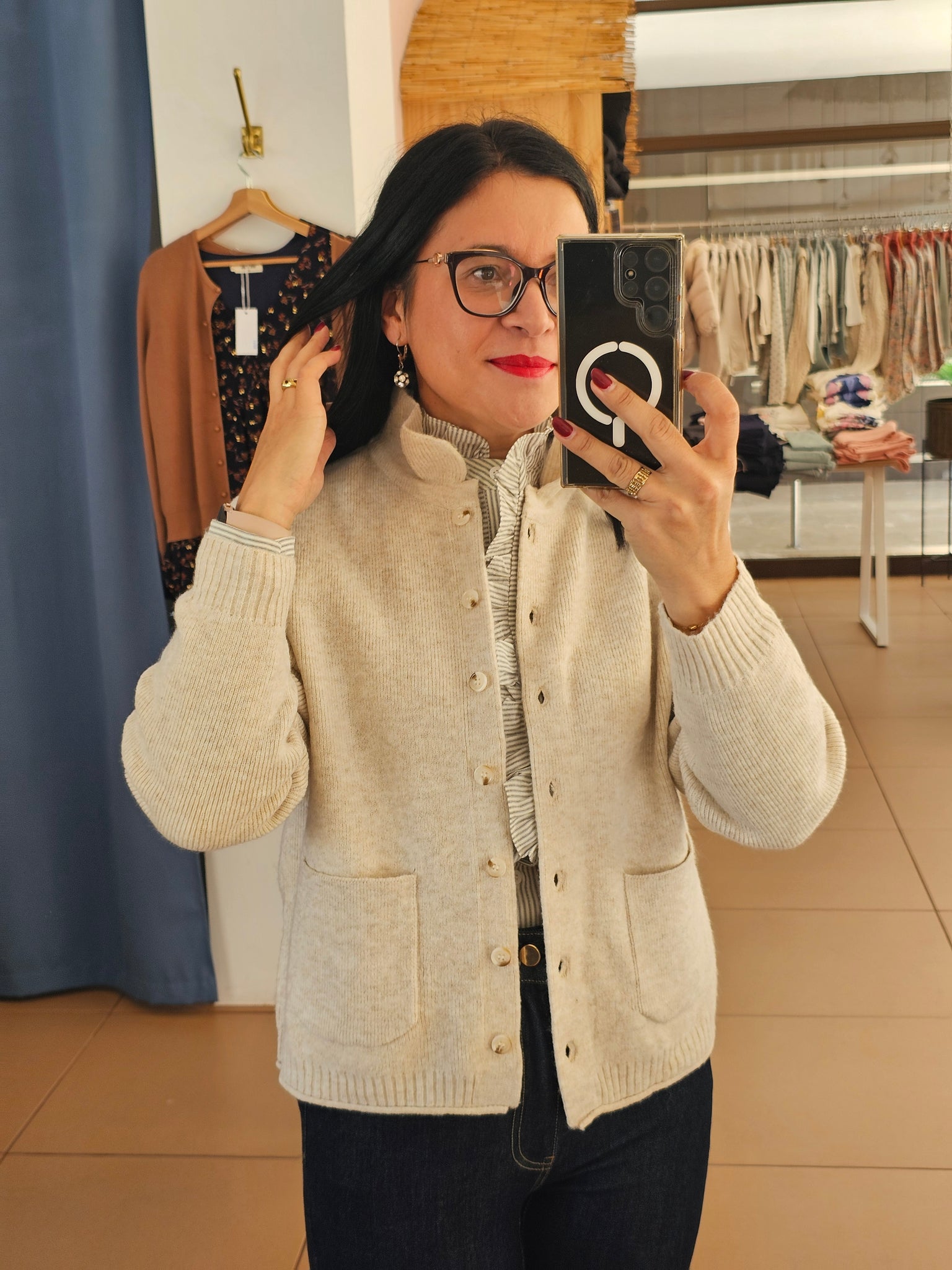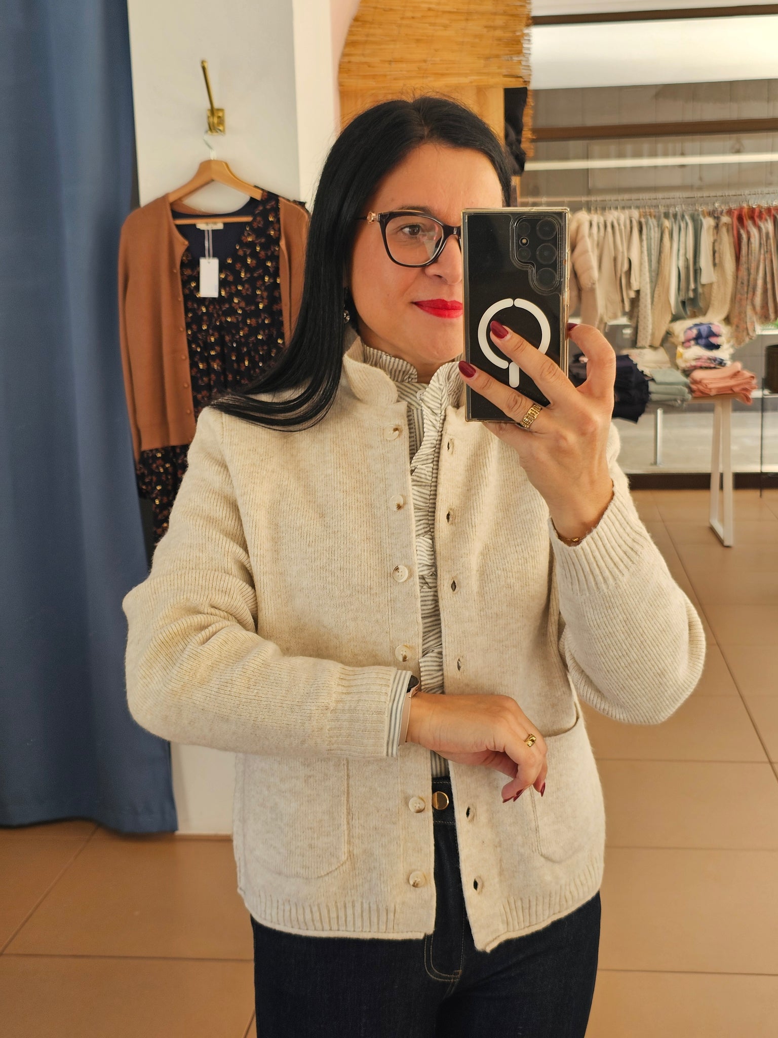 Casaco em malha. Gola com folhinho. Botões frontais, bolsos.