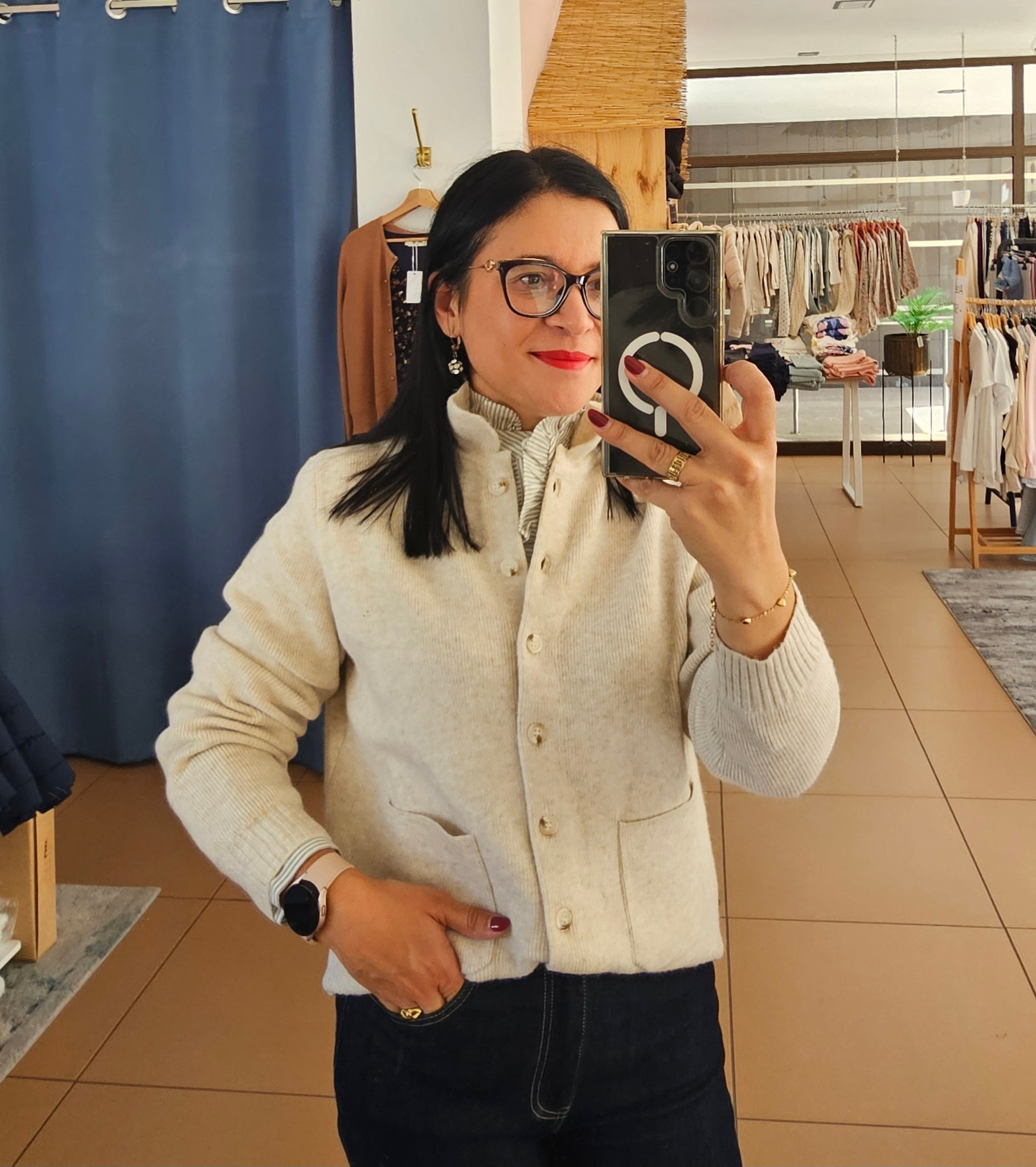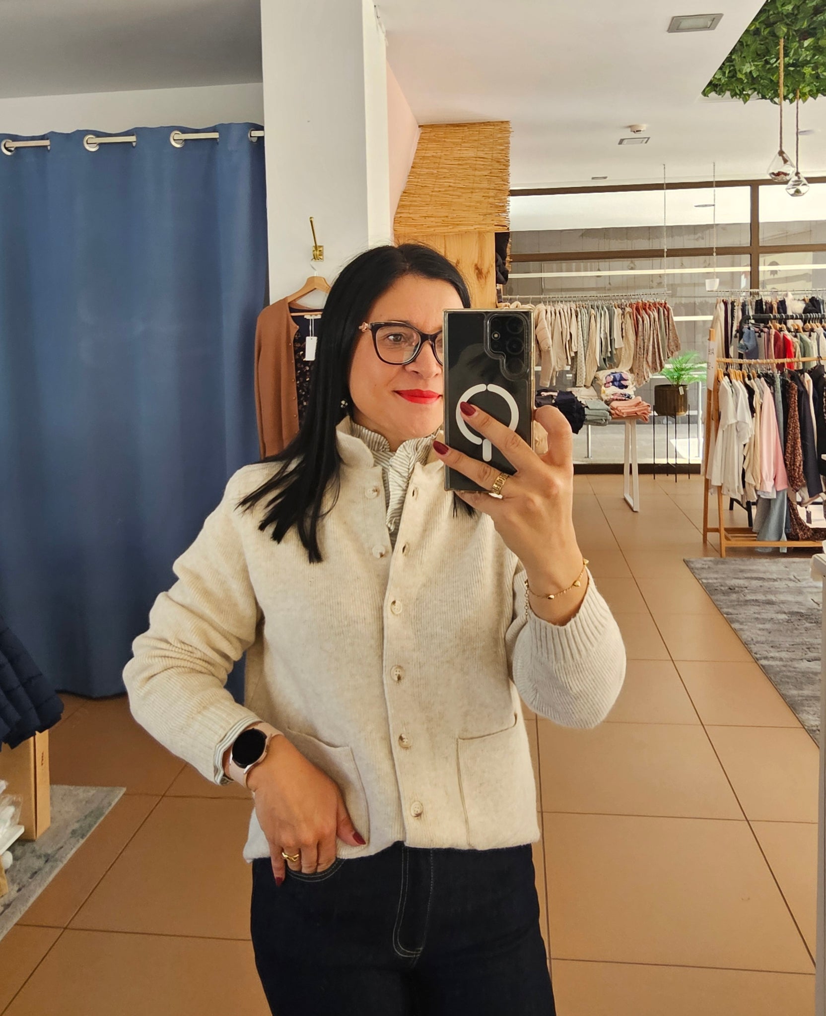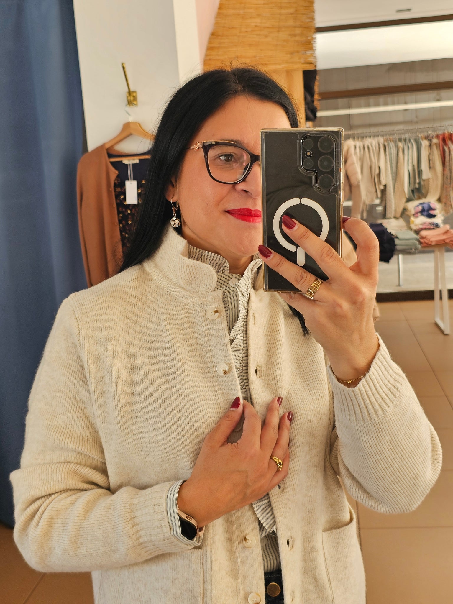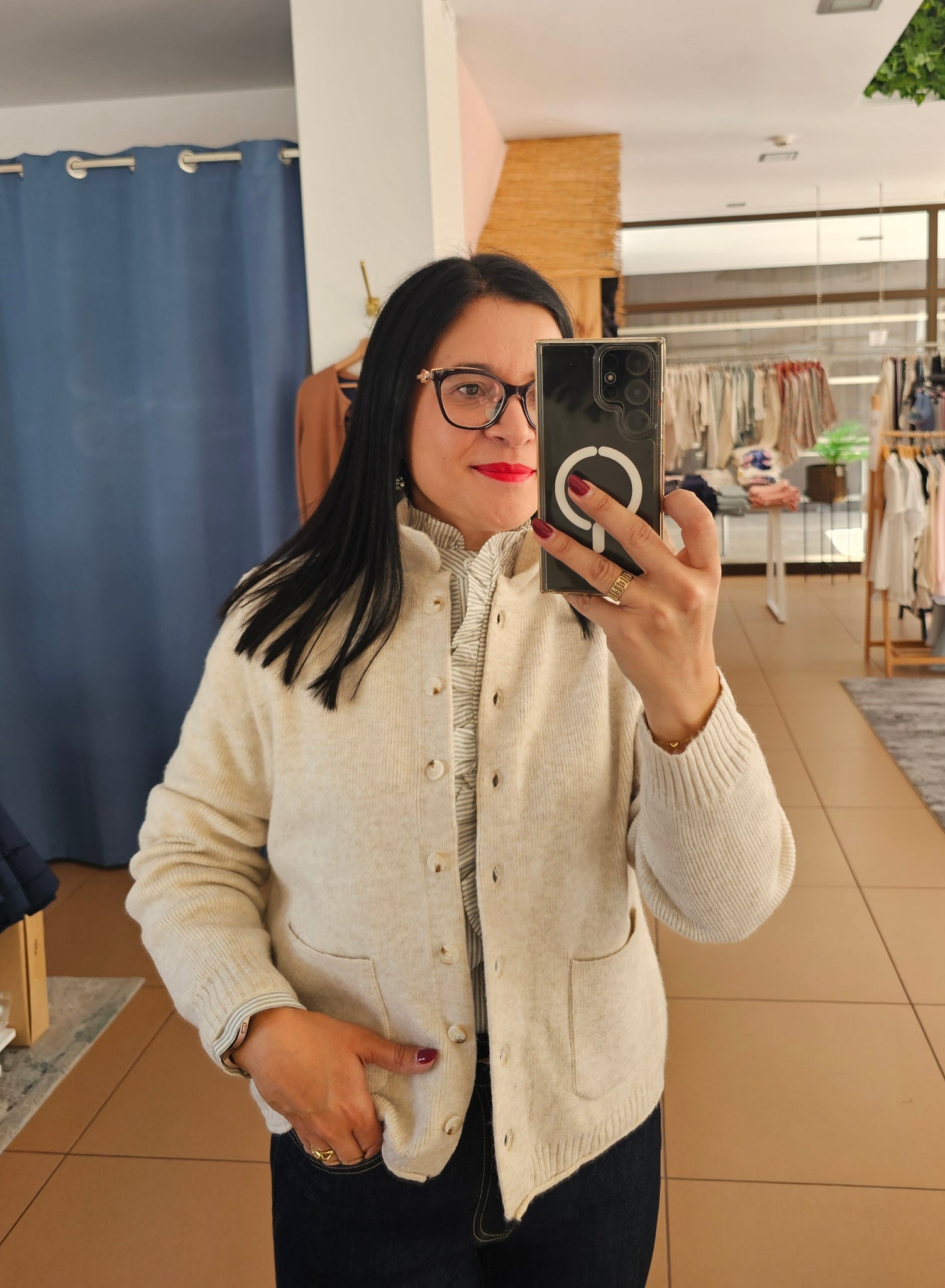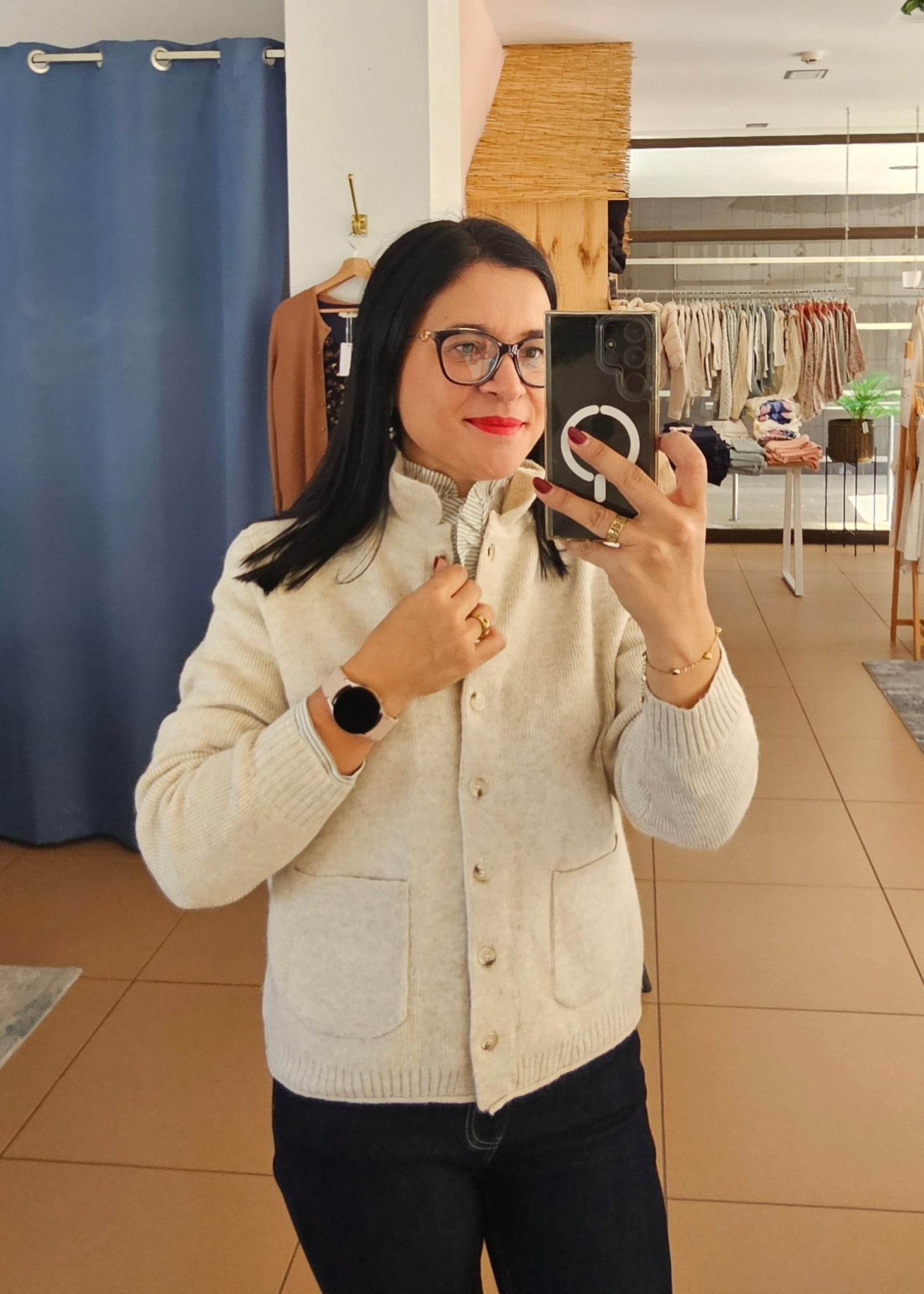 Casaco em malha. Gola com folhinho. Botões frontais, bolsos.