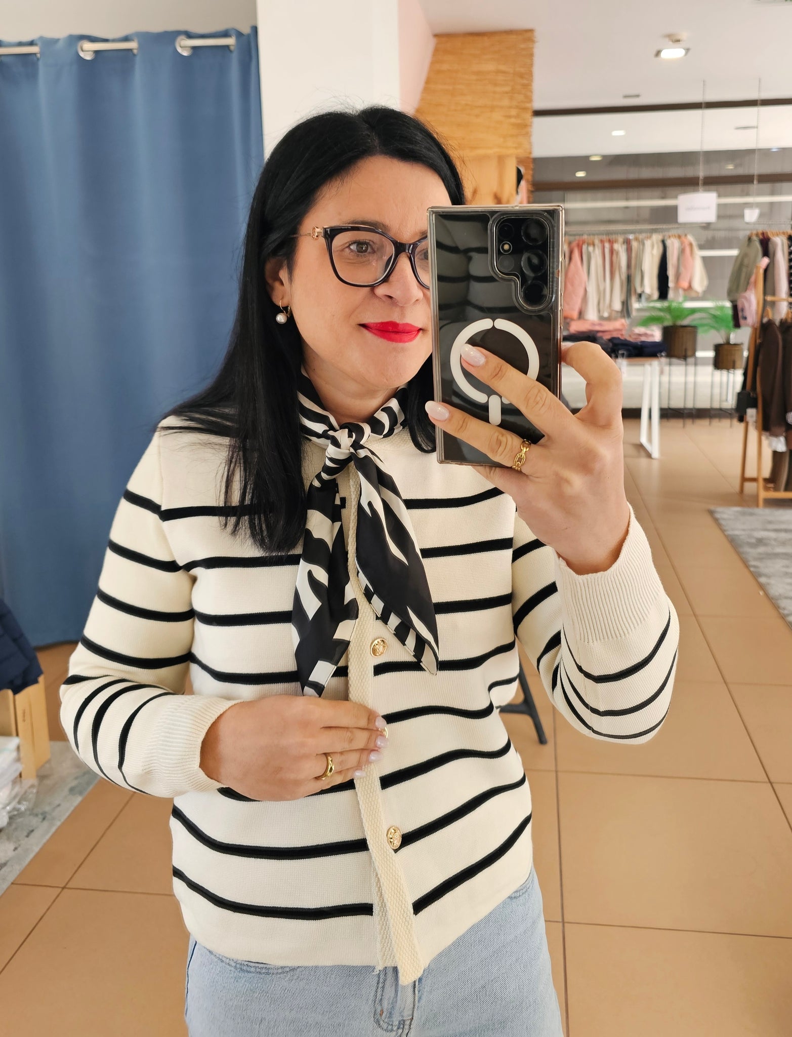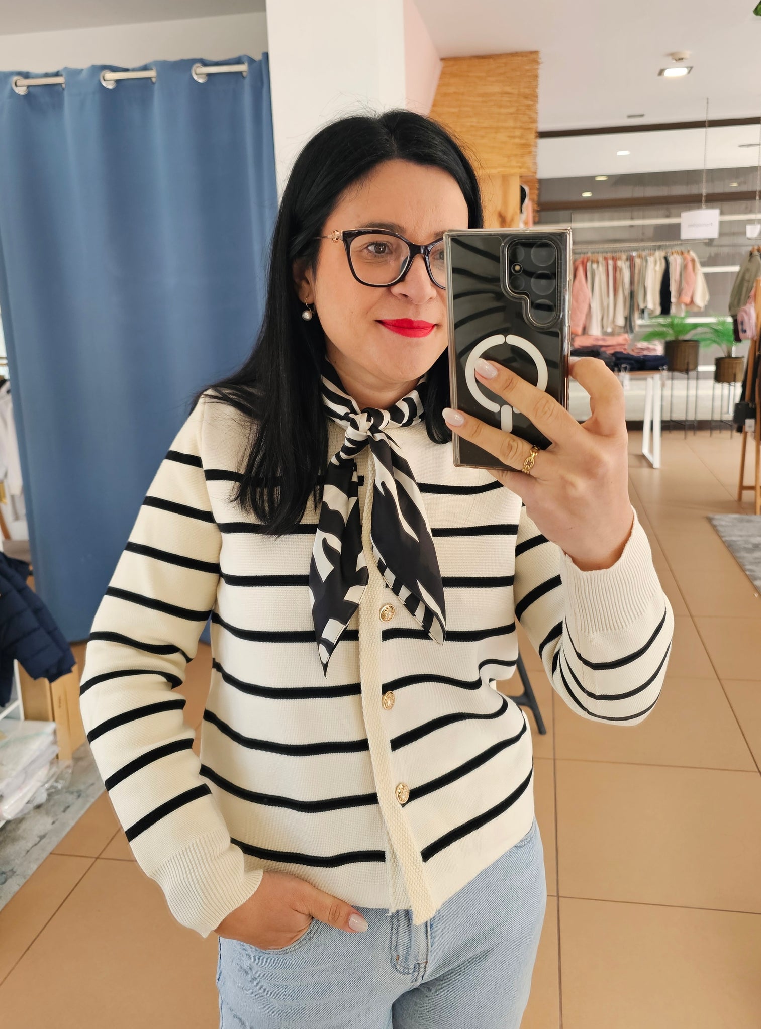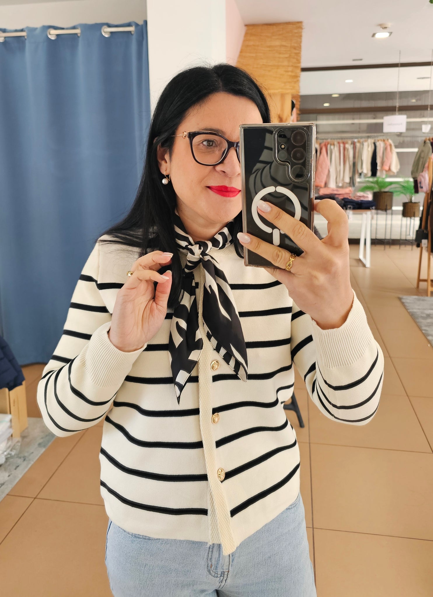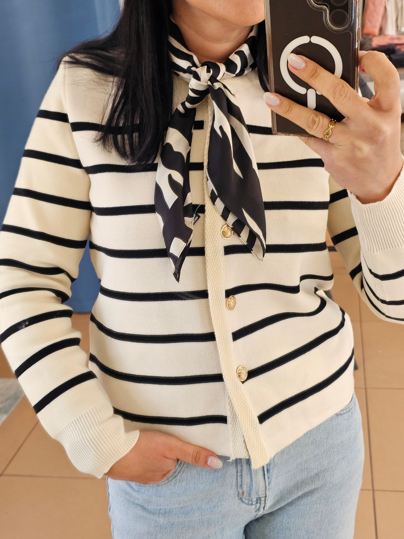 Casaco em malha. Botões dourados frontais.