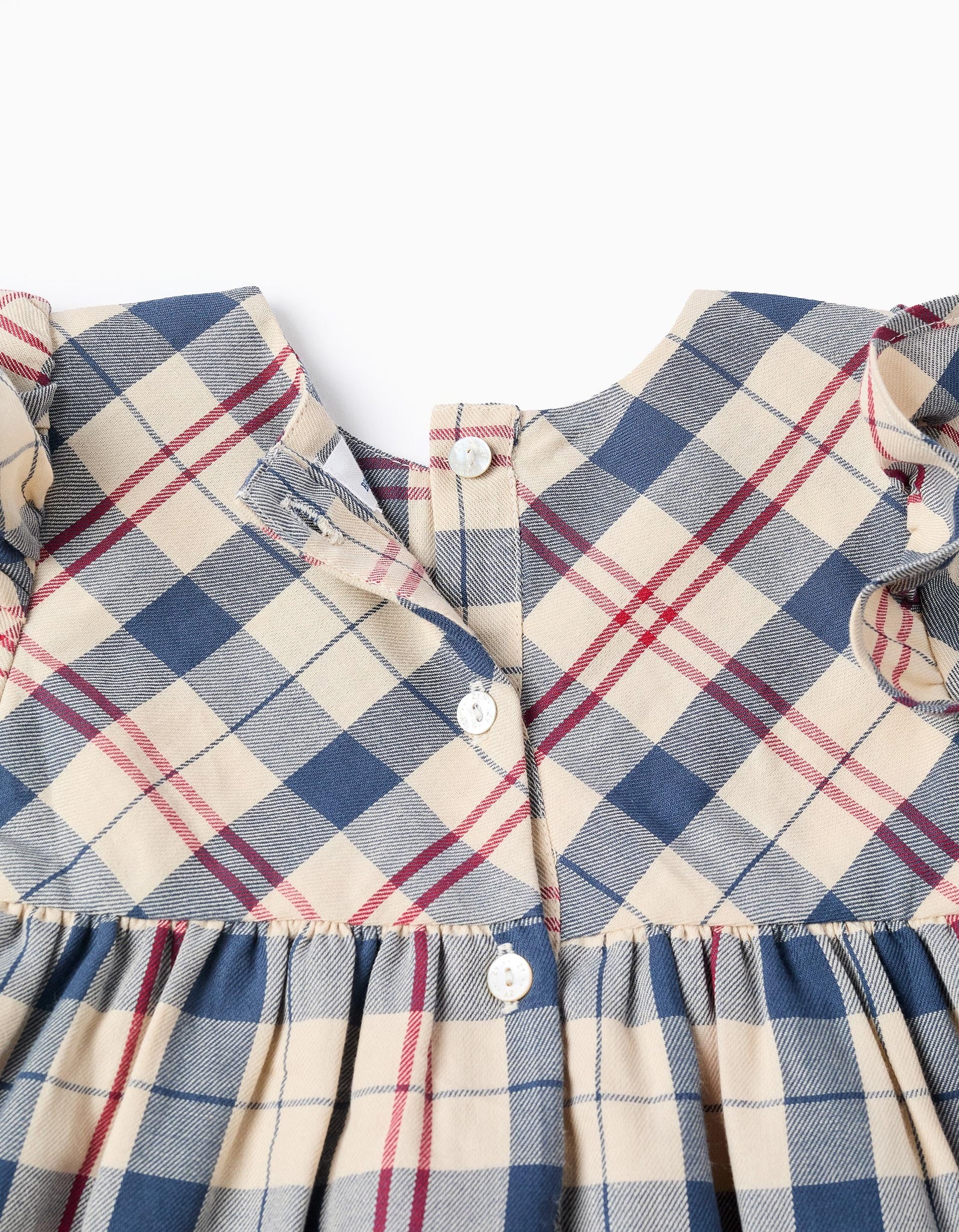 Coleção Brothers & Sisters. Vestido de manga comprida para bebé menina, com padrão axadrezado em tons de bege, azul e vermelho. 100% algodão. Mangas abalonadas com punhos elásticos. Detalhes de folhos nos ombros e na saia, para um toque elegante. Botões nas costas. Com forro de algodão, para maior volume e conforto. Para looks adoráveis entre irmãos e irmãs!