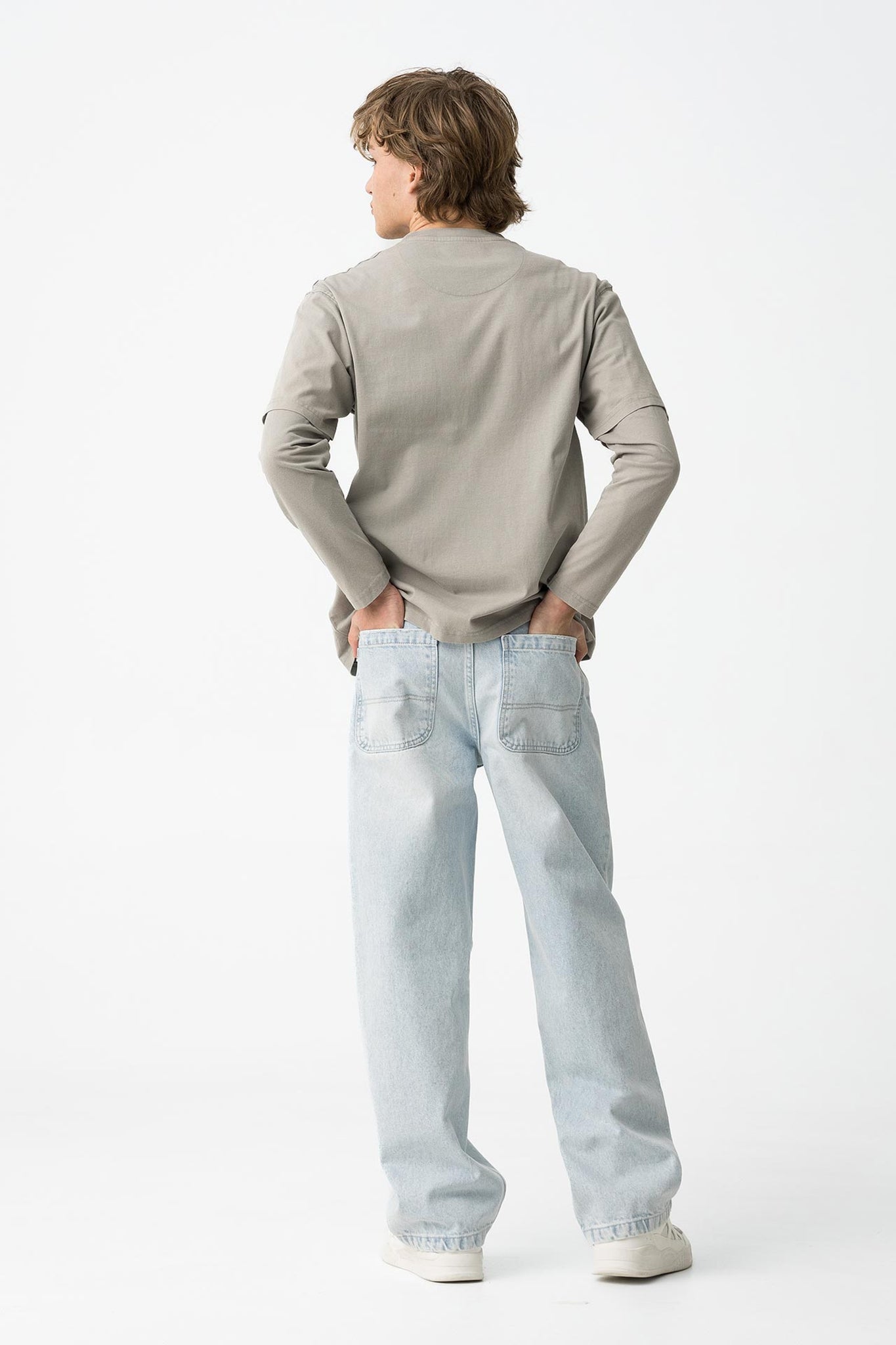 Jeans super wide leg com cinco bolsos. Fecho frontal de correr com botão metálico.