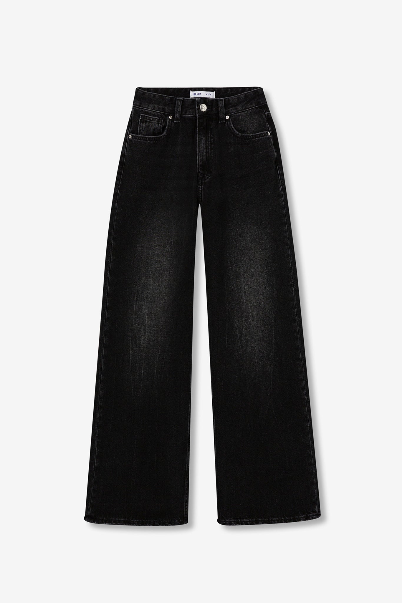 Jeans com perna larga de cintura alta com cinco bolsos. Fecho frontal com fecho zip e botão metálico..