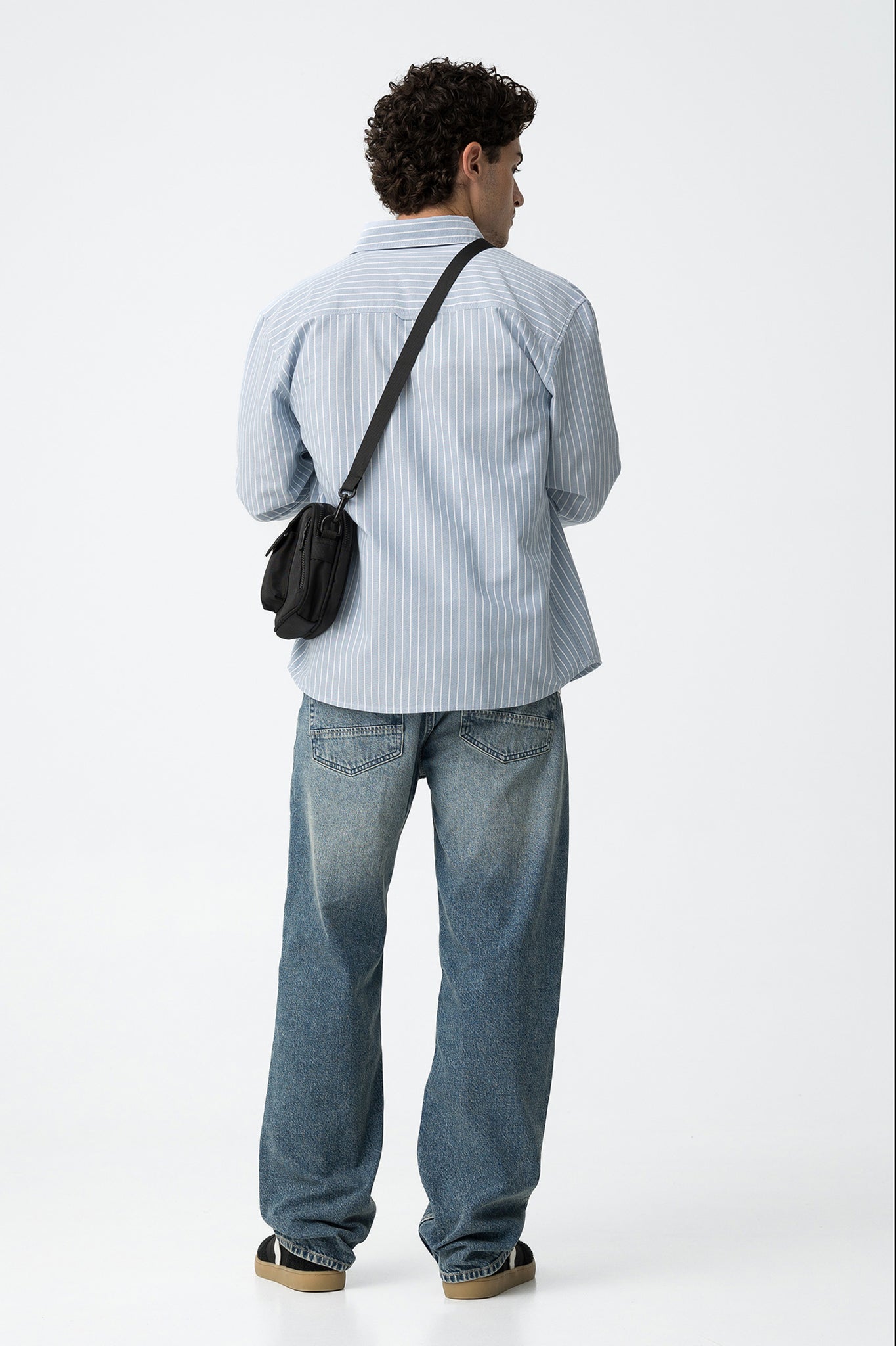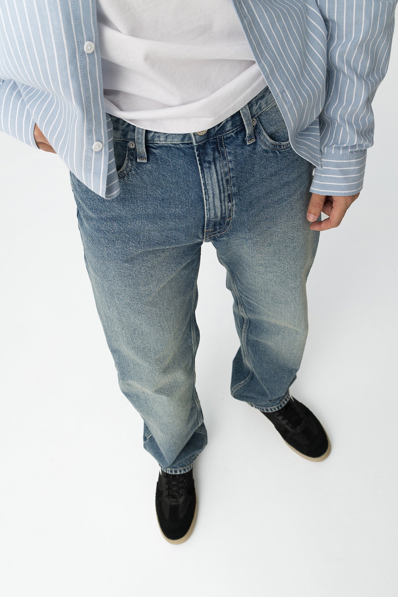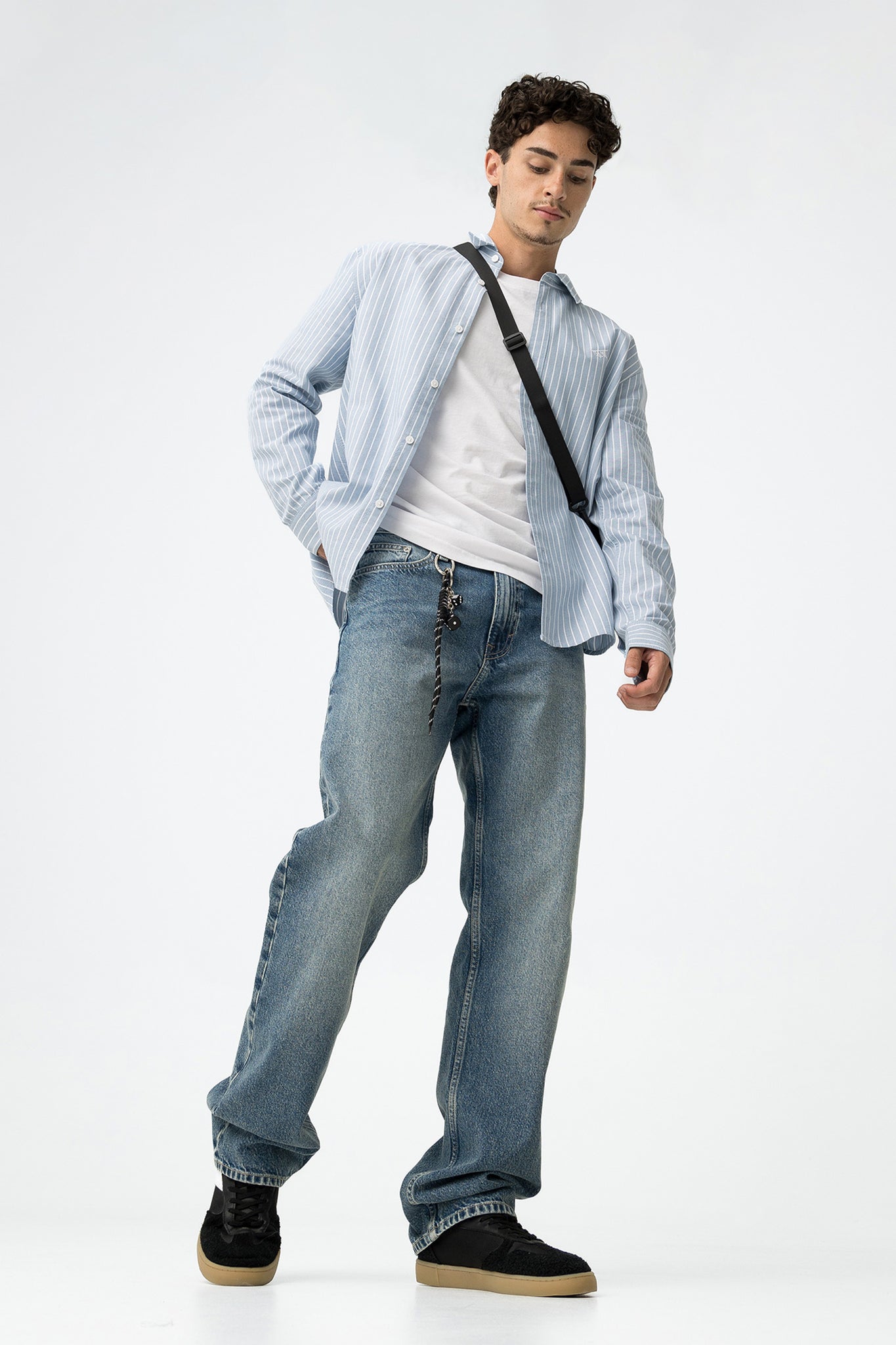 Jeans com perna larga com cinco bolsos. Fecho frontal com fecho zip e botão metálico.