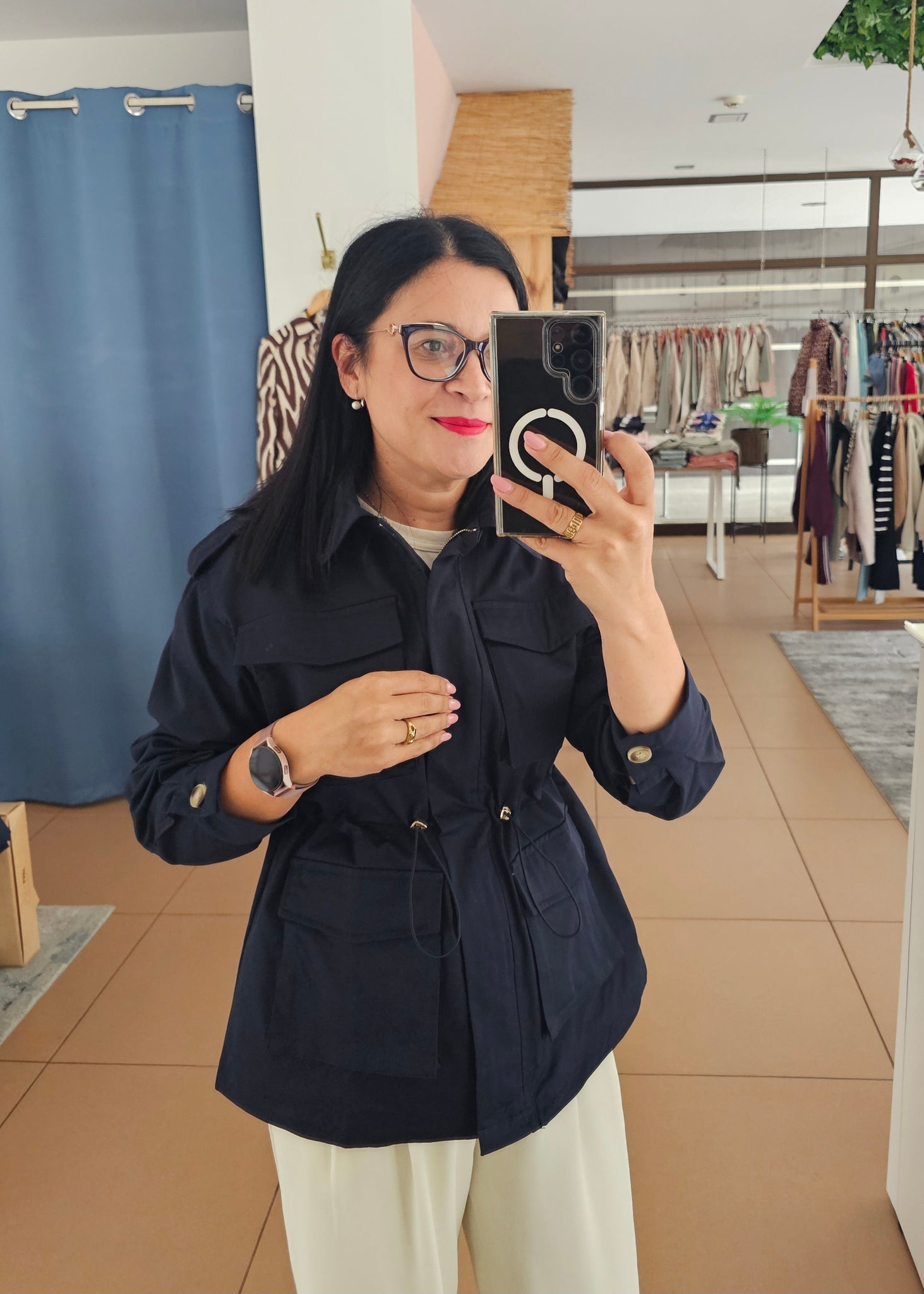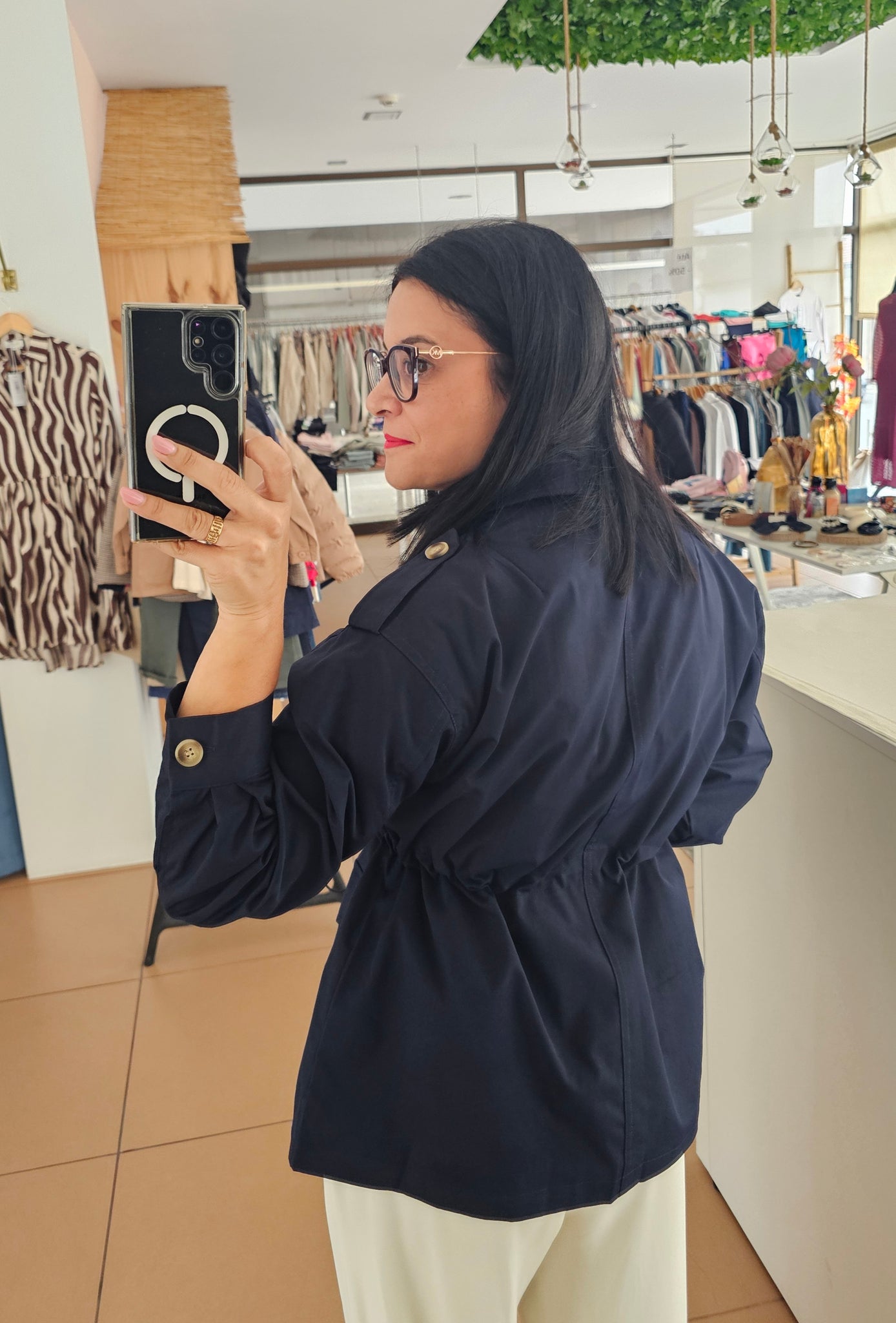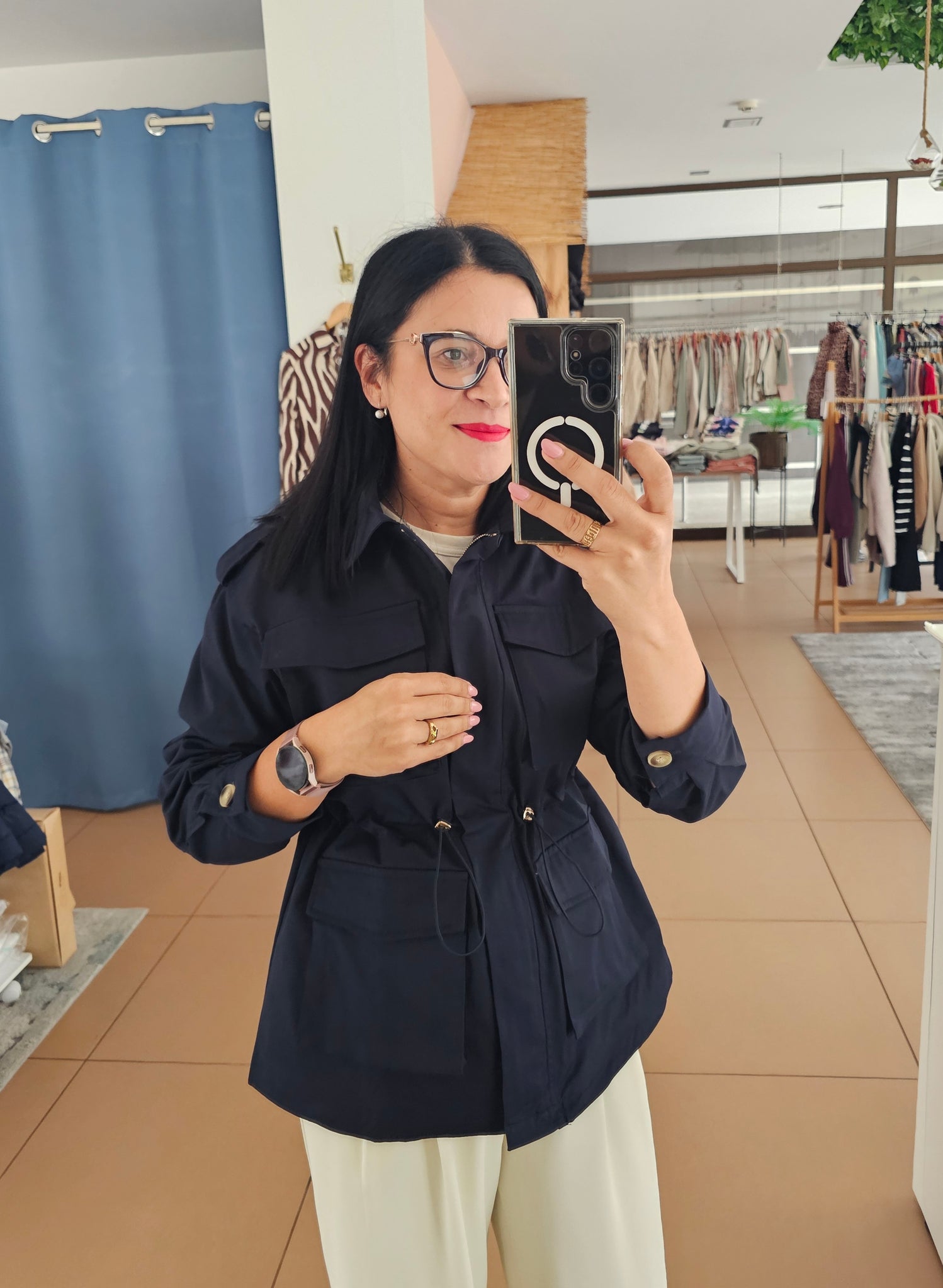 Parka curta. Cintura ajustável. Forrafa, fecho oculto dourado.