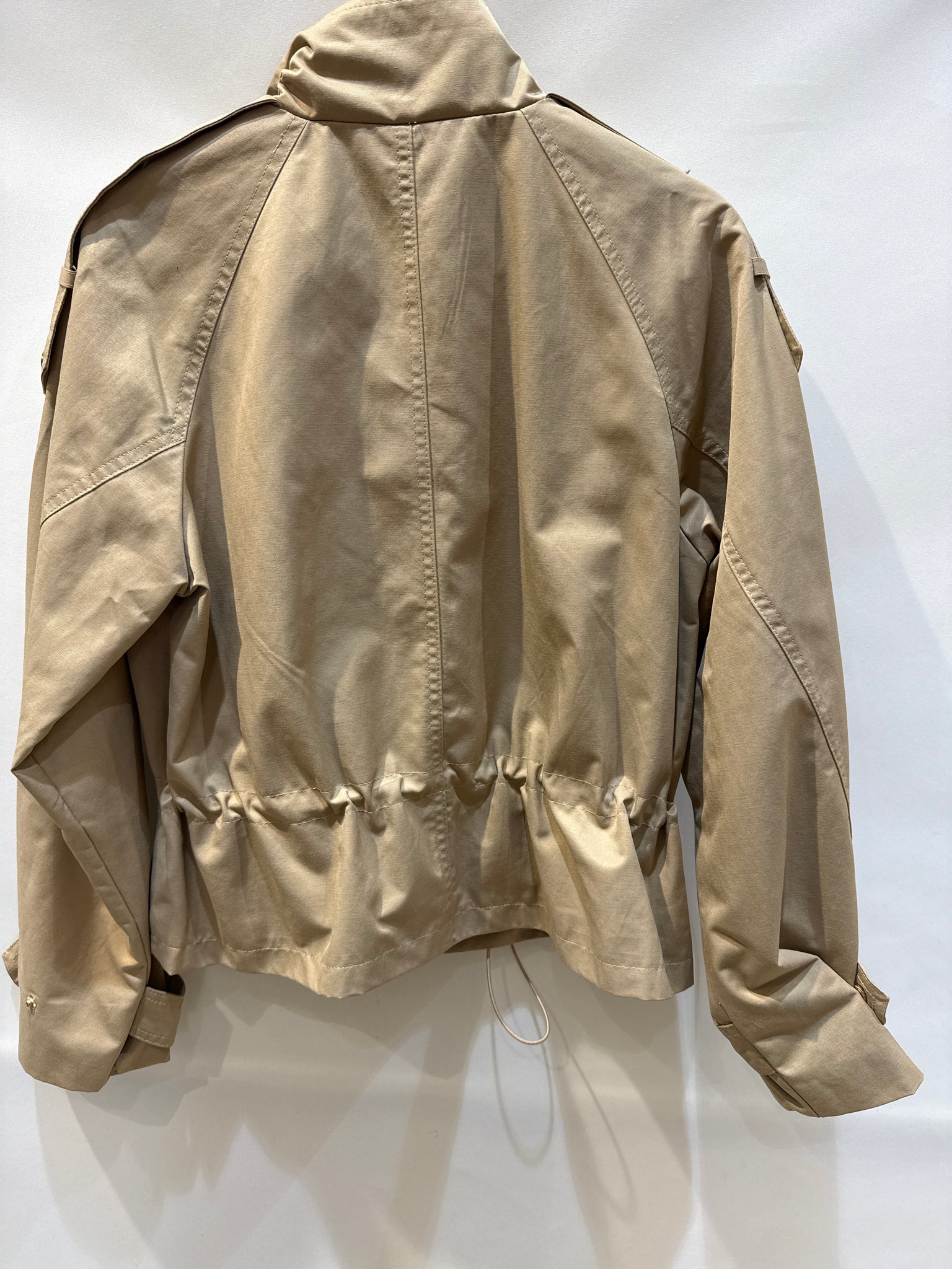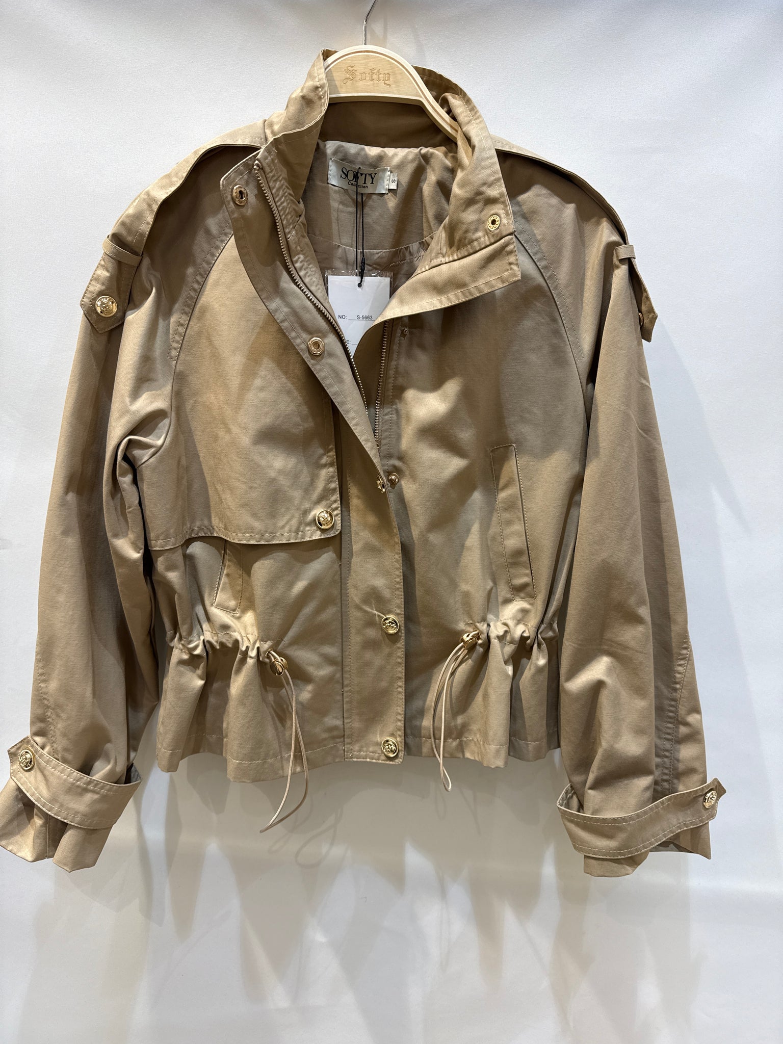 Parka curta. Cintura ajustável. Botões dourado, fecho oculto.