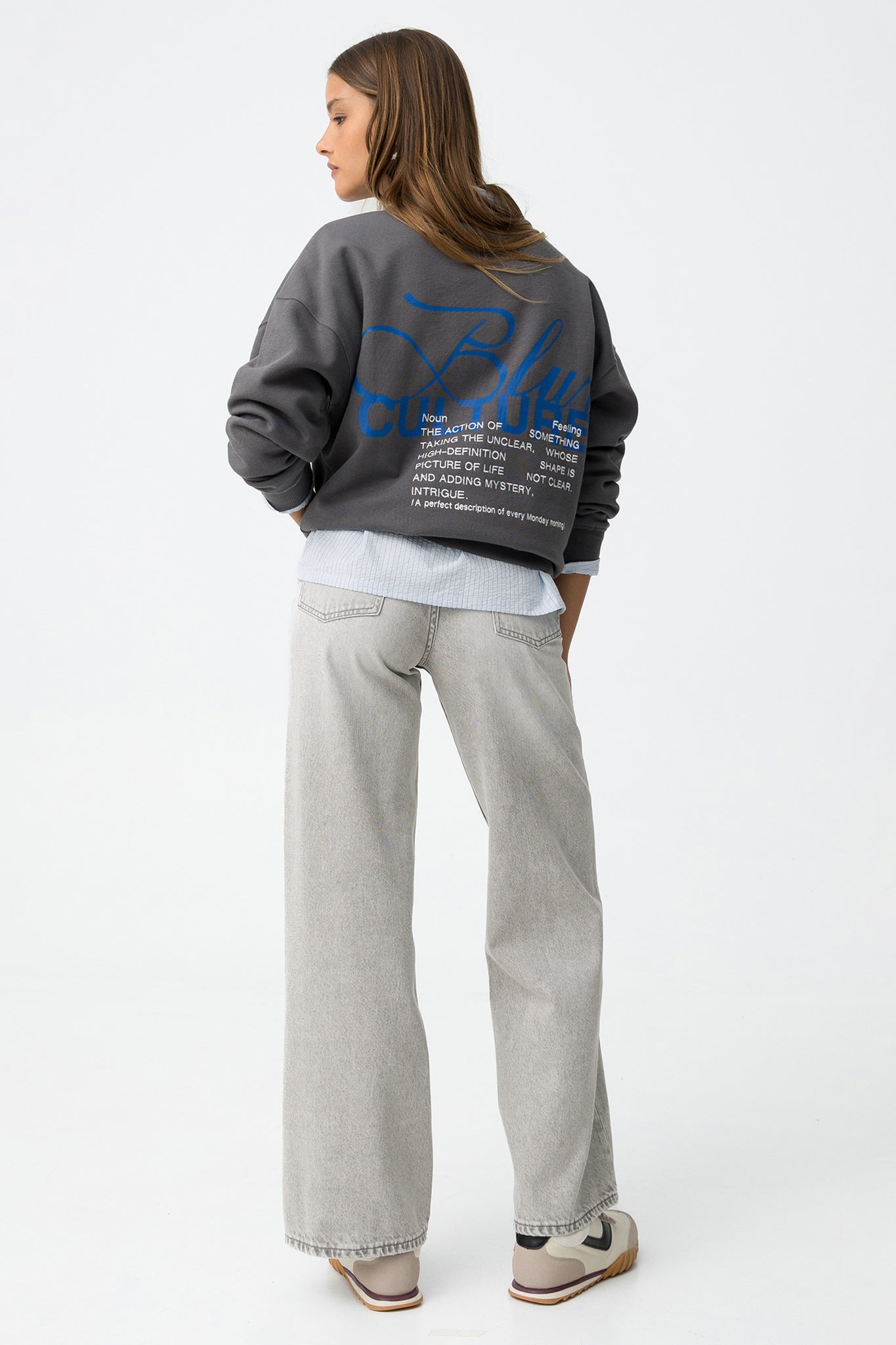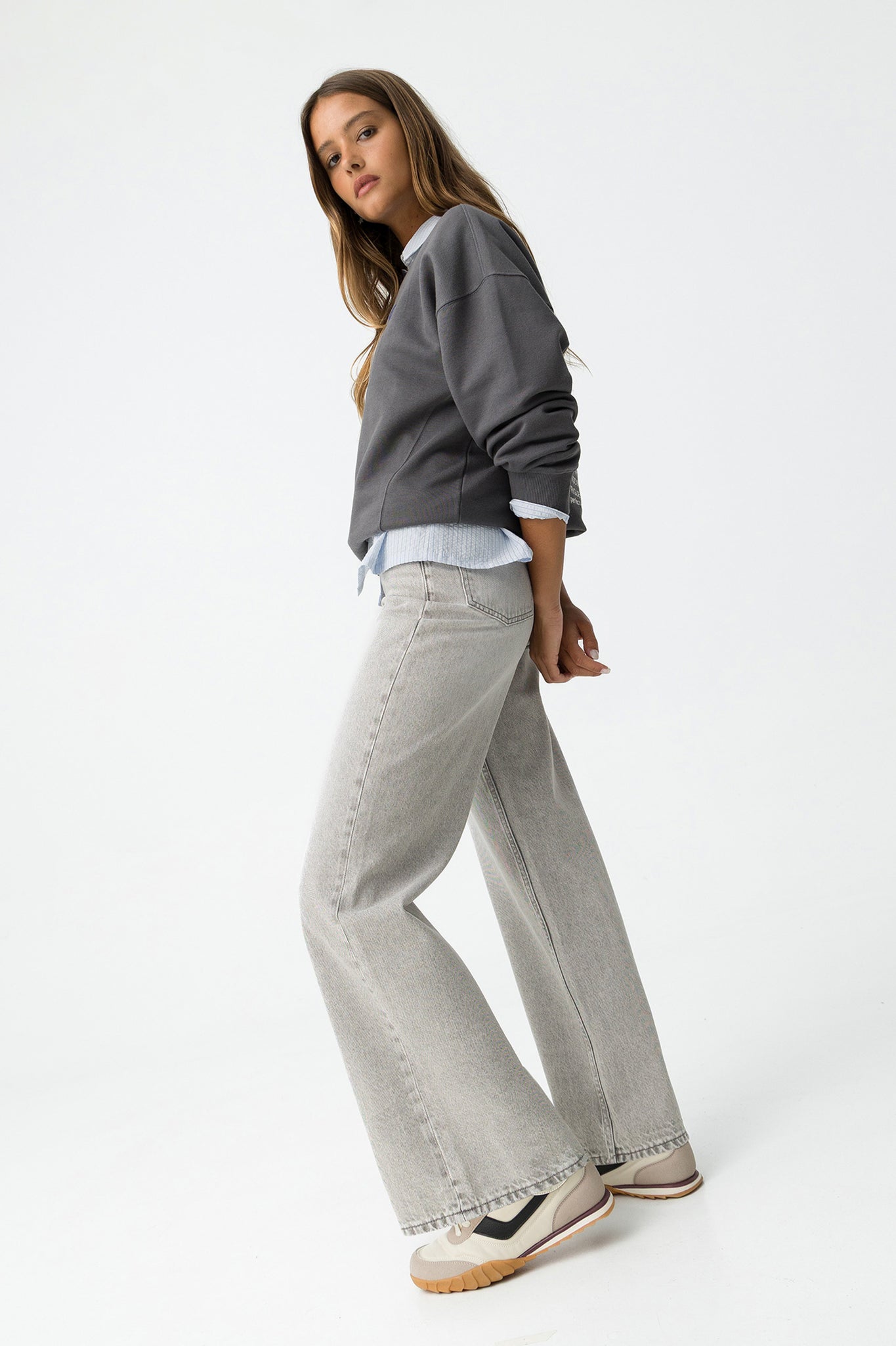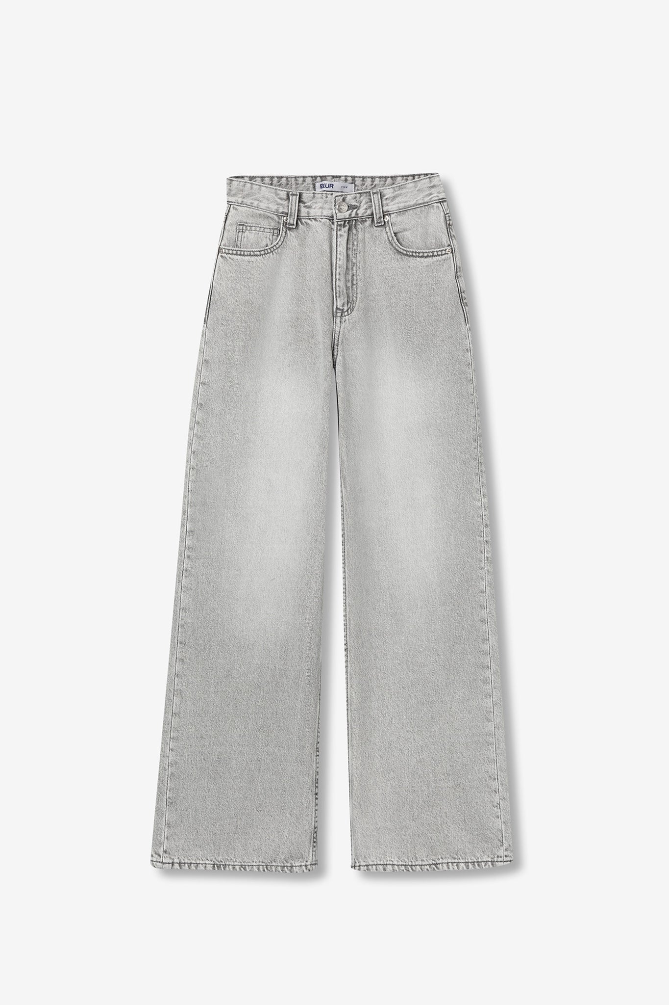 Jeans com cintura alta, perna larga e cinco bolsos. Abertura frontal com fecho de correr e botão metálico.