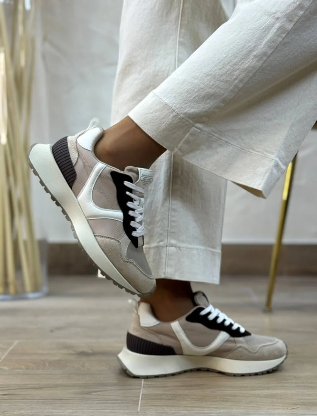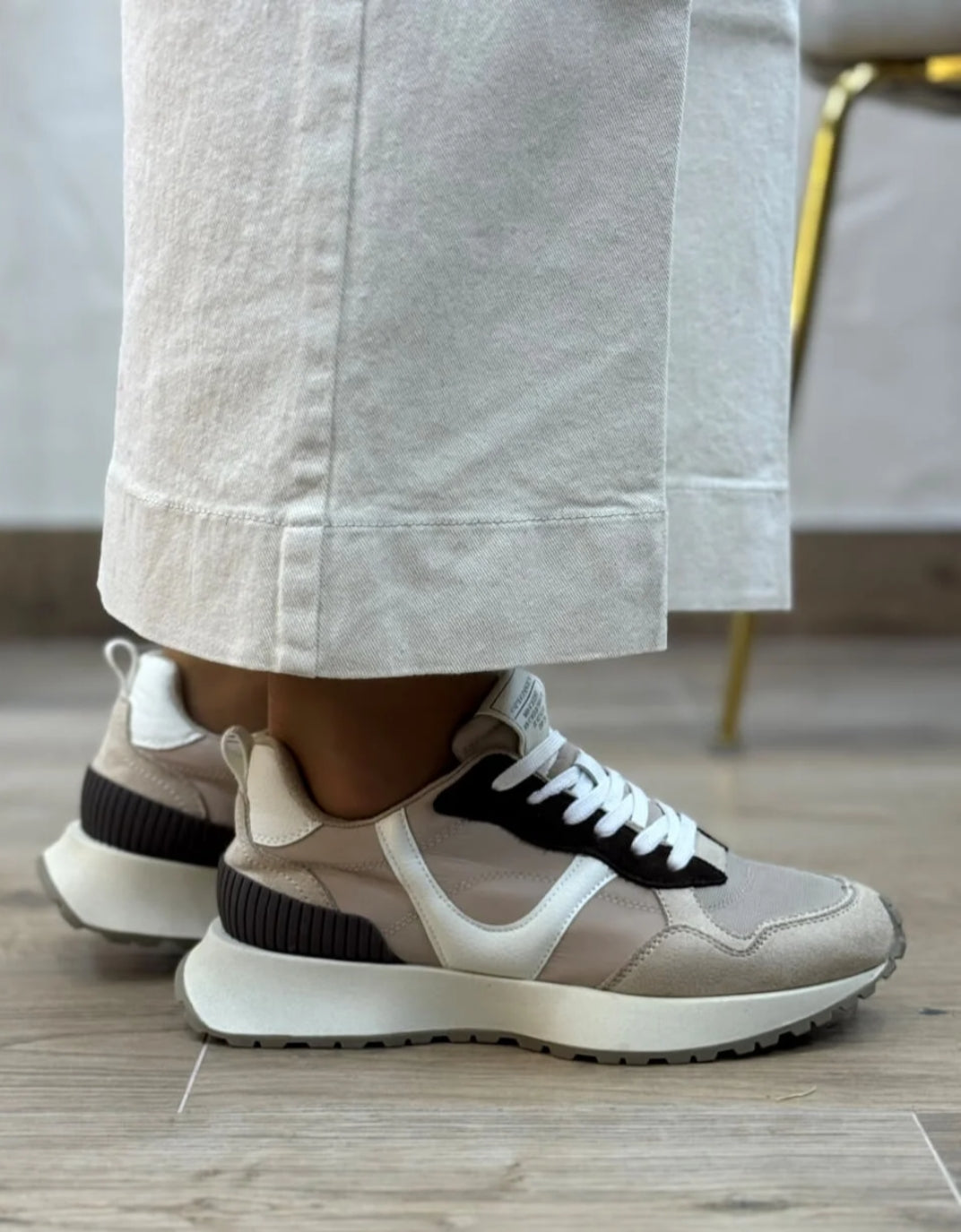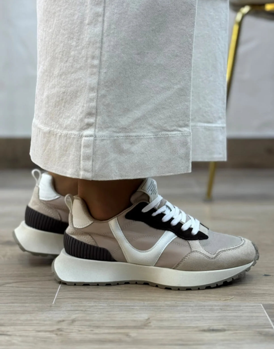 Sapatilhas desportivas, ponta redonda, sola alta, fecha com cordões.