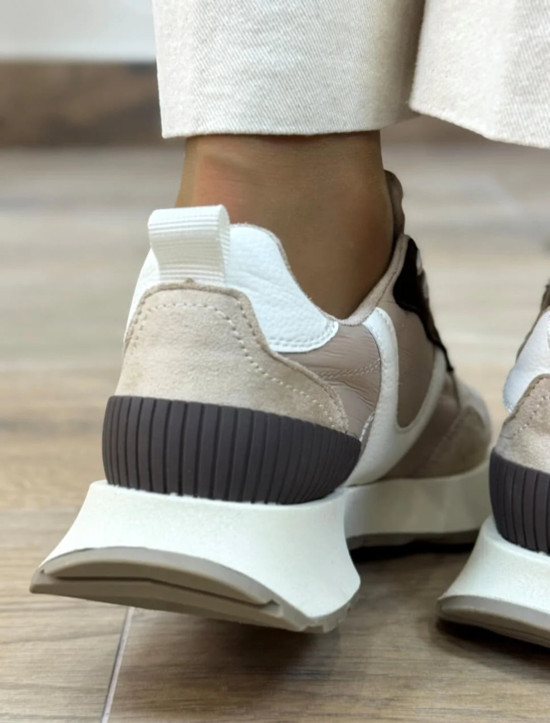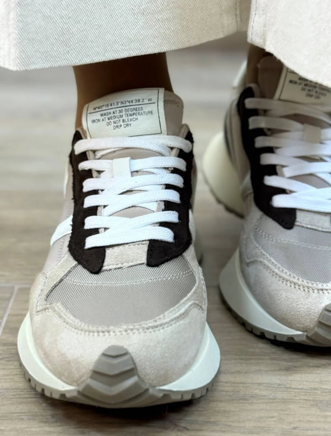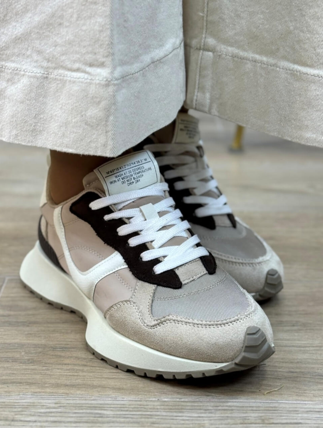 Sapatilhas desportivas, ponta redonda, sola alta, fecha com cordões.
