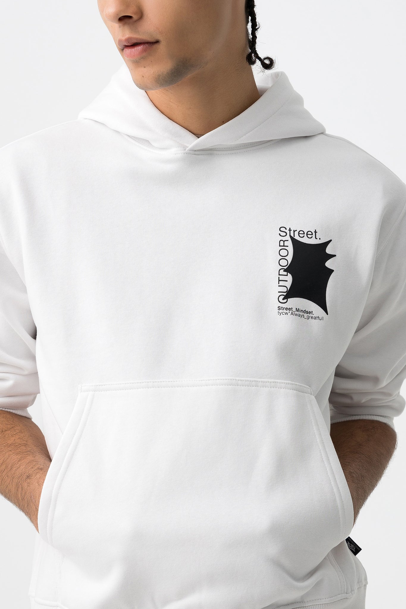 Hoodie relaxed fit com estampado frontal e bolsos canguru. Costas estampadas, capuz, manga longa e terminações em rib. Interior cardado.