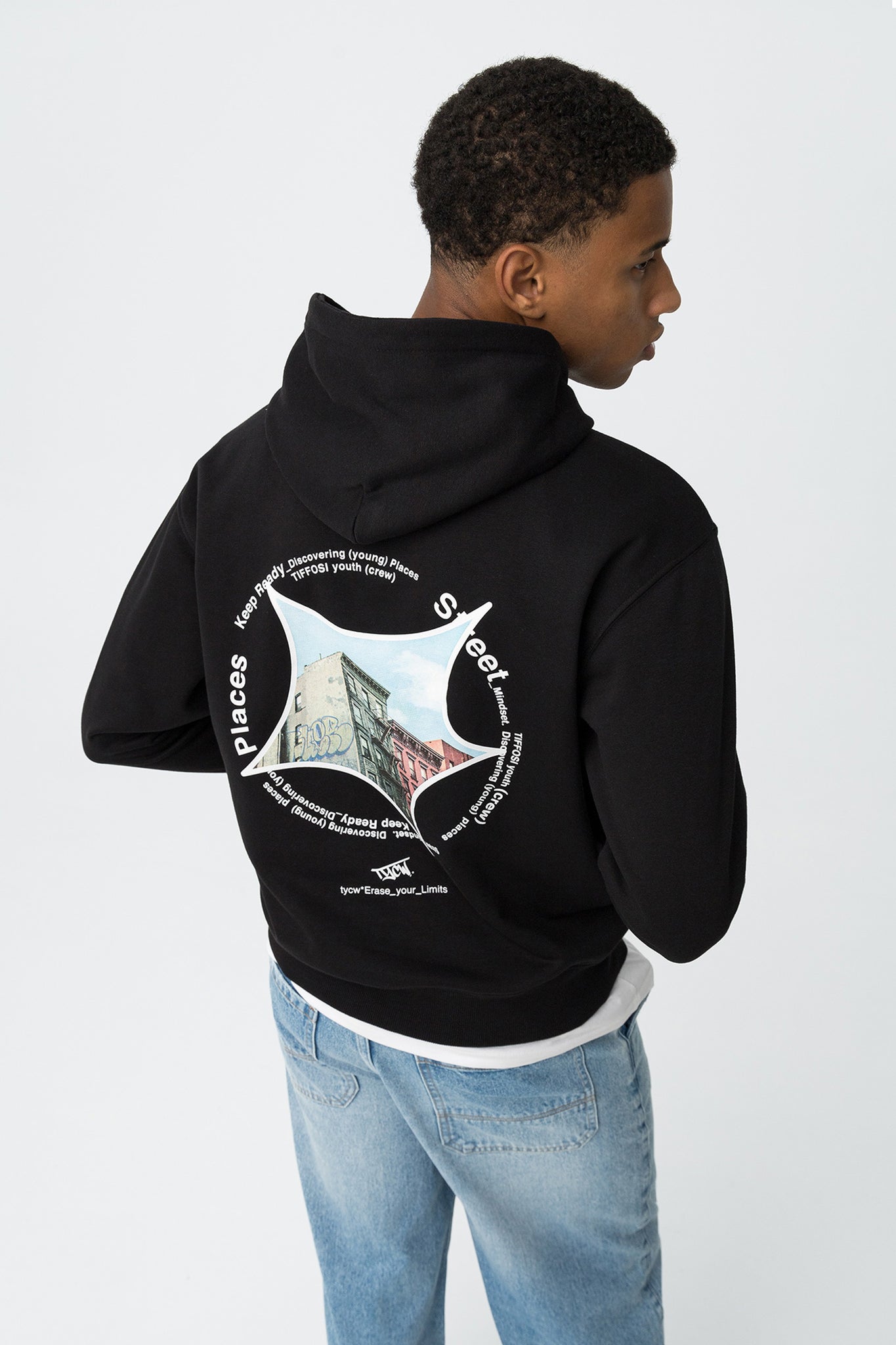 Hoodie relaxed fit com estampado frontal e bolsos canguru. Costas estampadas, capuz, manga longa e terminações em rib. Interior cardado.