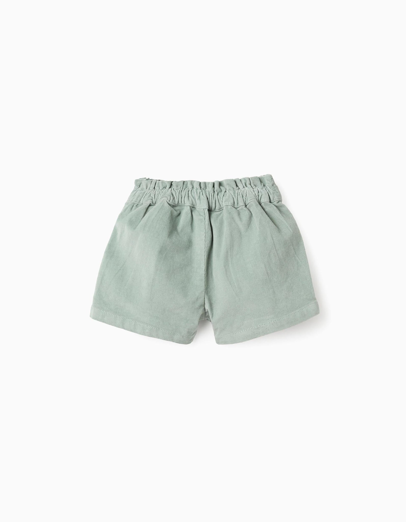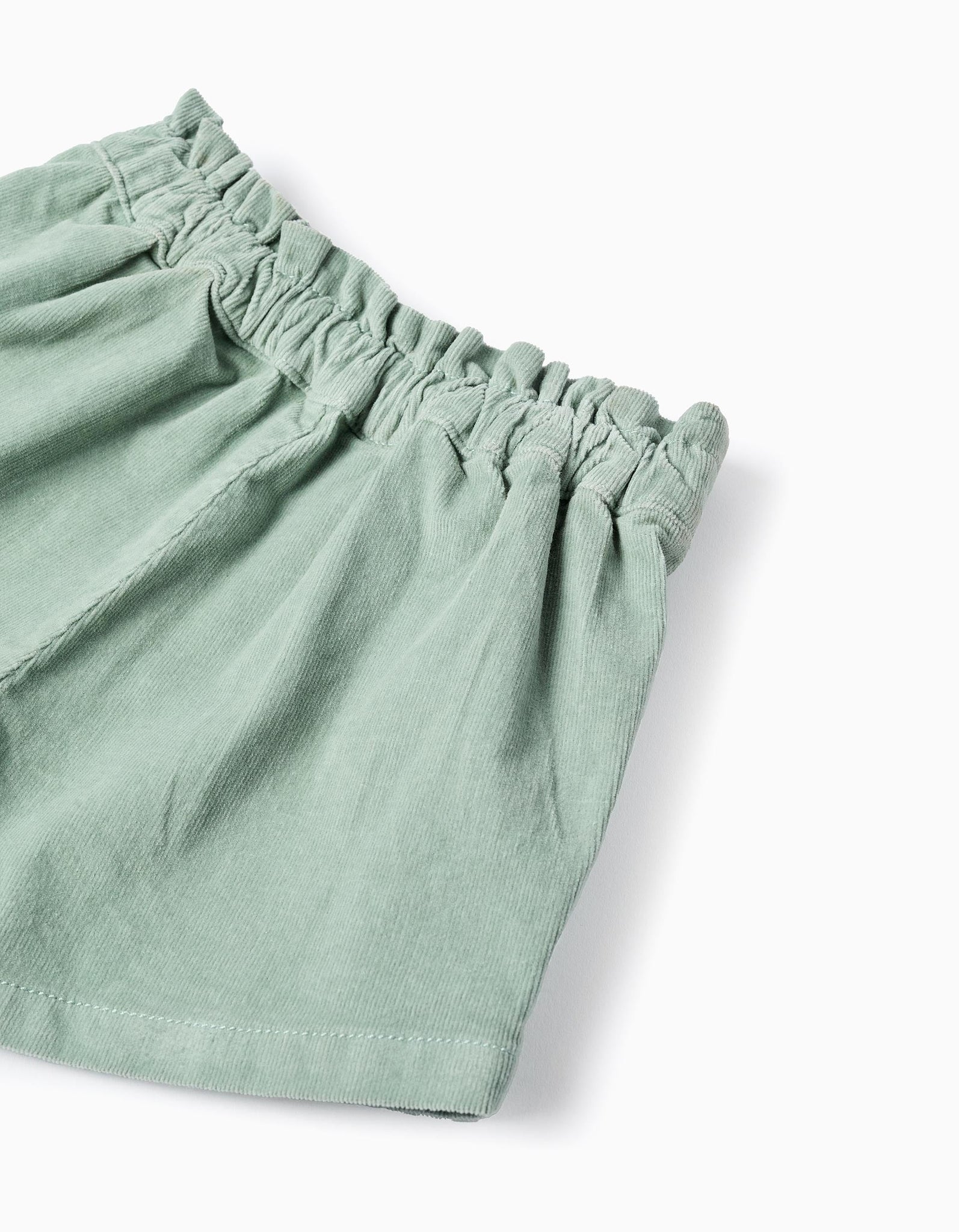 Calções de pregas verde-água para bebé menina, em bombazine de algodão com um toque de elasticidade para maior conforto e liberdade de movimentos. Cintura com folhinhos, elástica na parte de trás e ajustável no interior com elásticos e botões. Fecho de correr lateral para vestir com facilidade. Para looks de outono-inverno coloridos e sempre na moda!