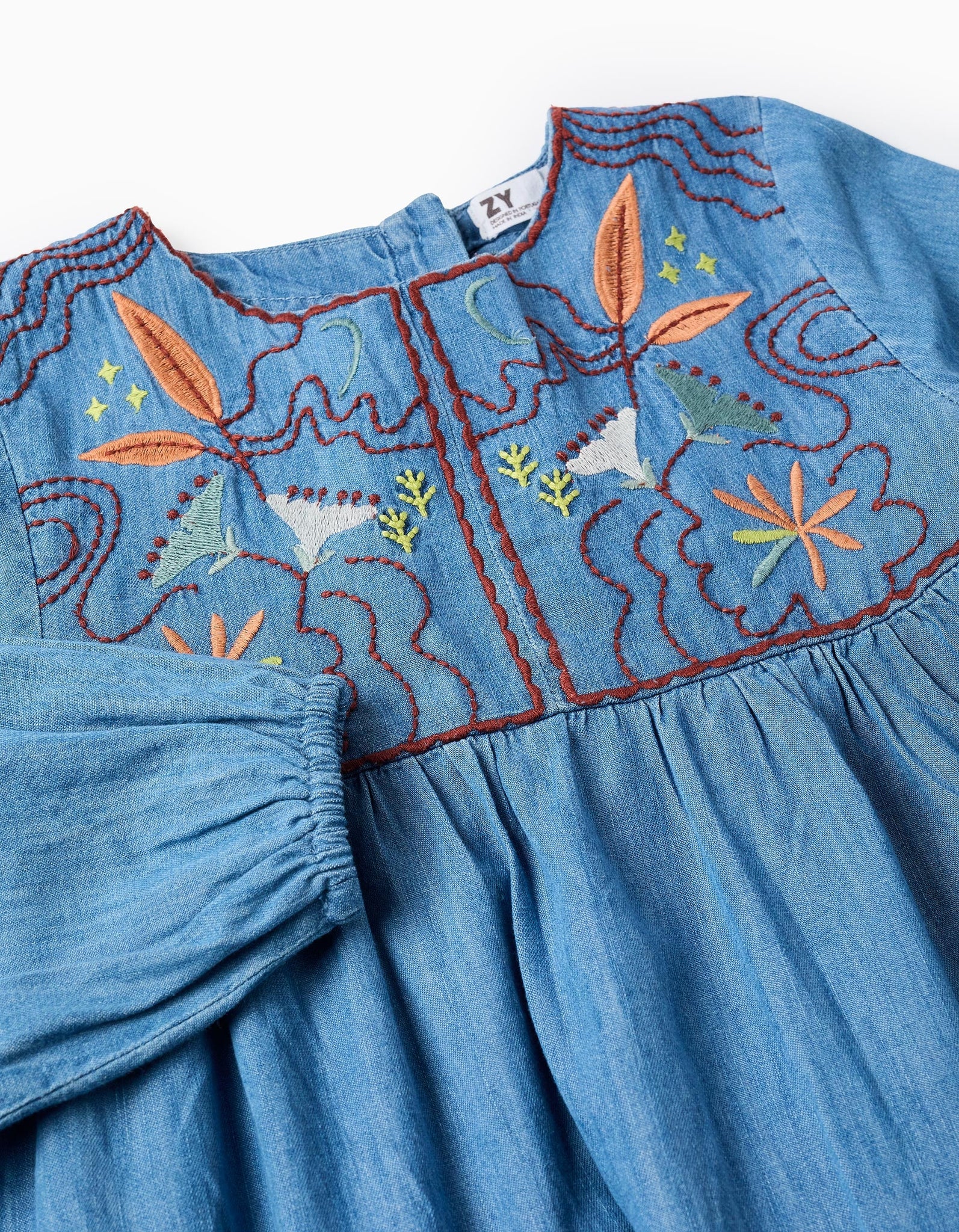 Vestido de Ganga em Algodão com Bordados para Menina, Azul Zippy