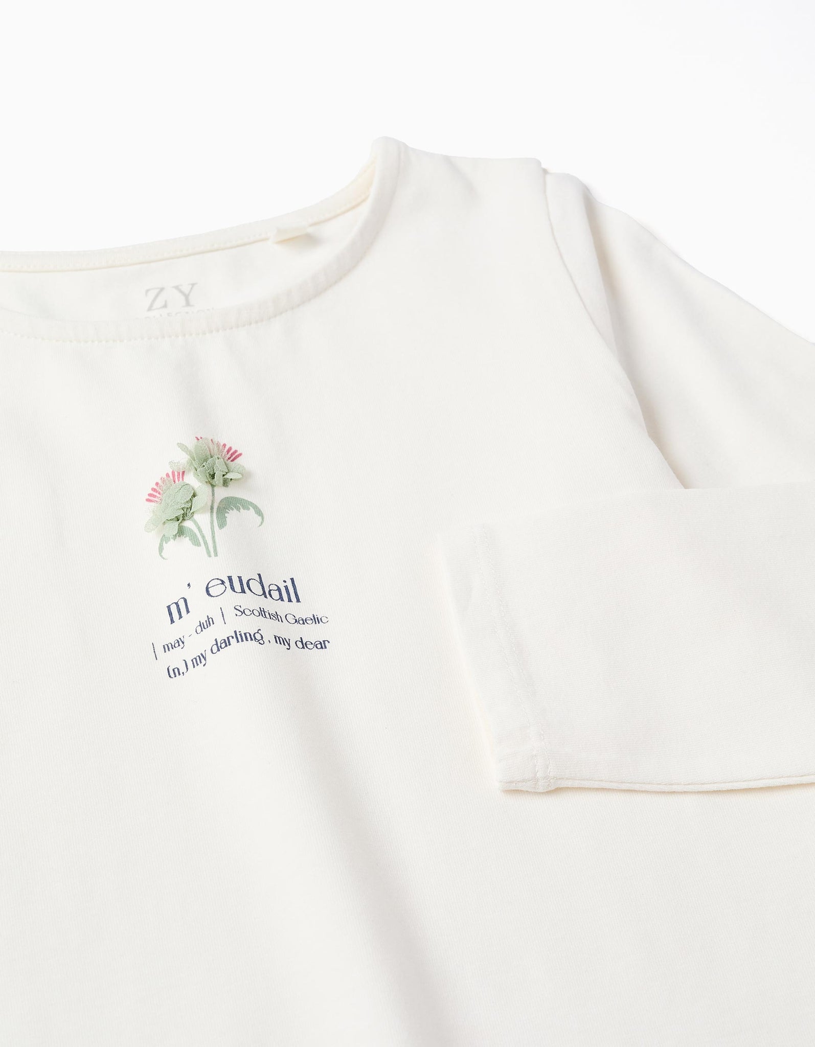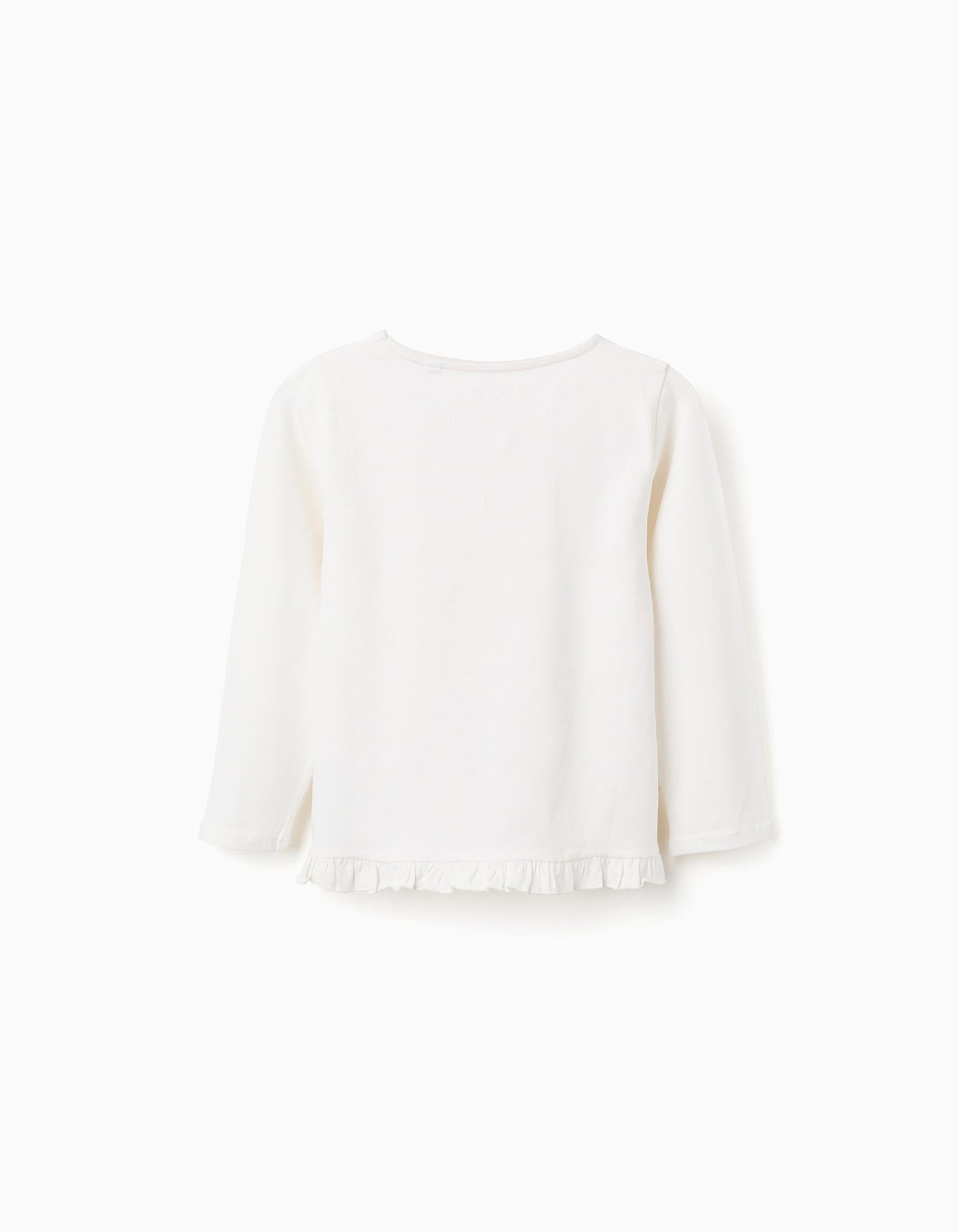 T-shirt de manga comprida branca para menina, em algodão com um toque de elasticidade para maior conforto e liberdade de movimentos. Estampado frontal e folhos na base. Etiqueta interior estampada para não irritar a pele. Corte evasé. Elegante e versátil, ideal para os looks do dia-a-dia!