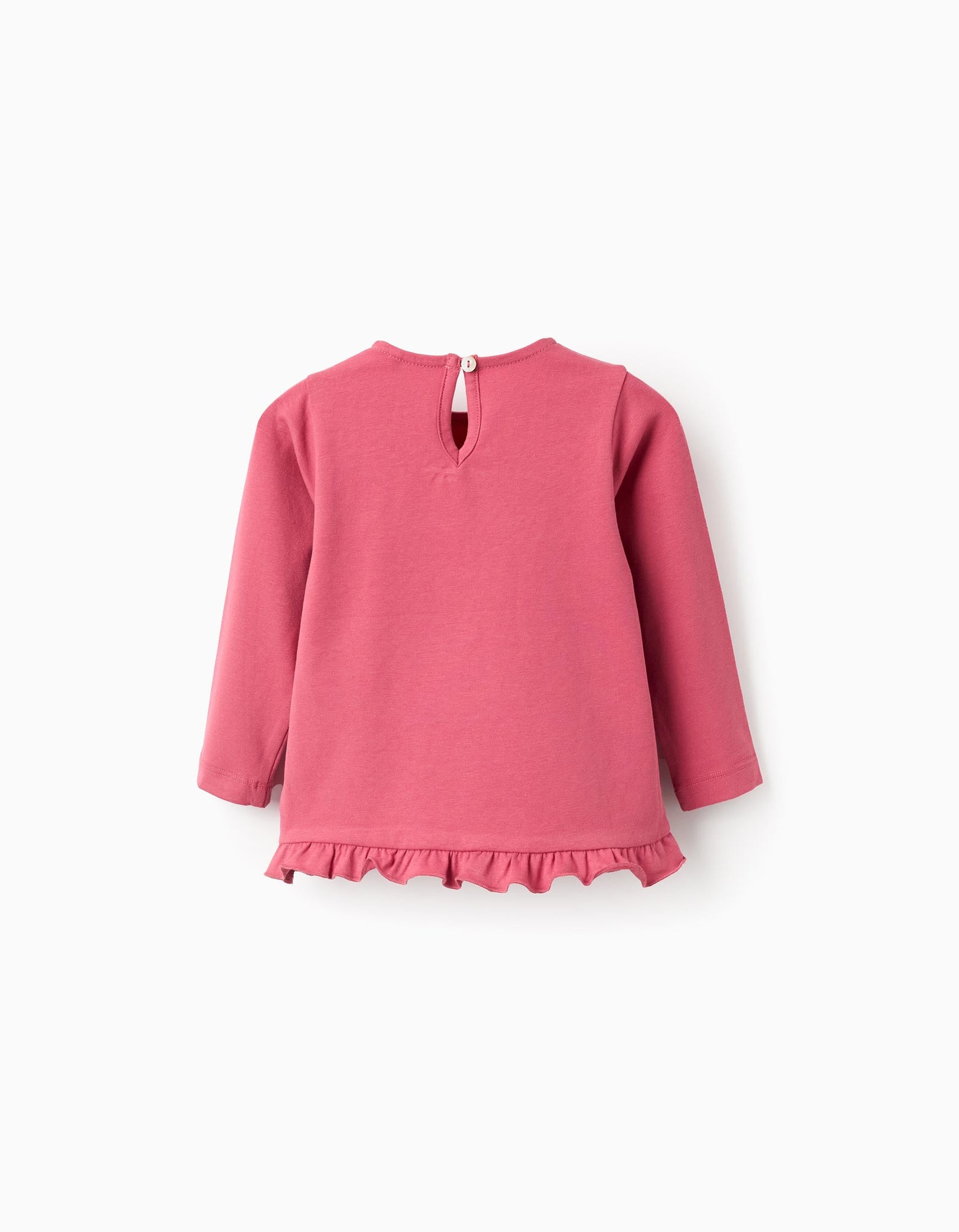 T-shirt de manga comprida verde-água para bebé menina, 100% algodão. Folhinhos ao redor dos ombros e estampado frontal. Etiqueta interior estampada para não irritar a pele. Botão nas costas para vestir facilemente. Cirte evasé. We Care: artigo com certificado Oeko-Tex Standard 100, que garante a ausência de substâncias nocivas ou irritantes para a pele.