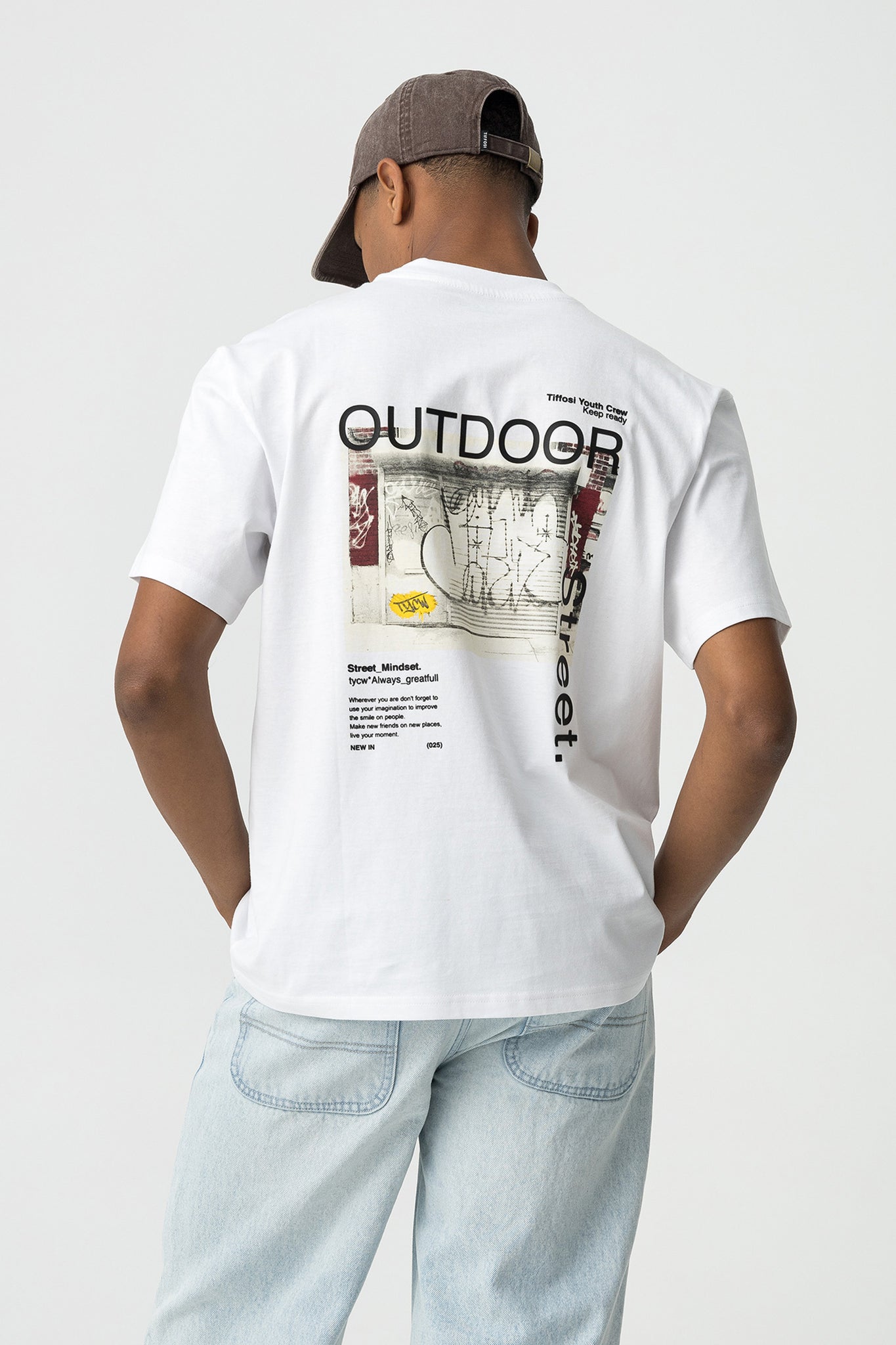 T-shirt relaxed fit de algodão com estampado graffiti e mensagens em alto relevo. Decote redondo e manga curta.
